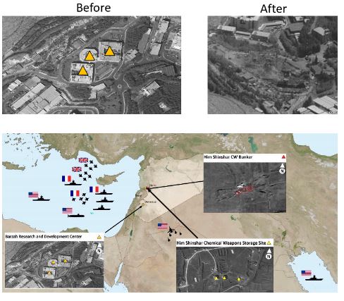 Το αμερικανικό Πεντάγωνο έδωσε φωτογραφίες από τις τρεις εγκαταστάσεις που σφυροκοπήθηκαν γιατί θεωρήθηκε ότι σχετίζονται με τη δημιουργία χημικών όπλων, που χρησιμοποίησε το καθεστώς Ασαντ στην επίθεση στη Ντούμα.