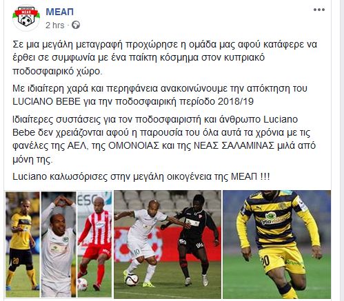 Σύμφωνα με ανακοίνωση της ΜΕΑΠ, ο Μπεμπέ θα αγωνίζεται με τα χρώματα της ομάδας τους για τη σεζόν 2018-19 και θα είναι ο τέταρτος σταθμός του Βραζιλιάνου στο νησί μας μετά από ΑΕΛ, Ομόνοια και Σαλαμίνα.