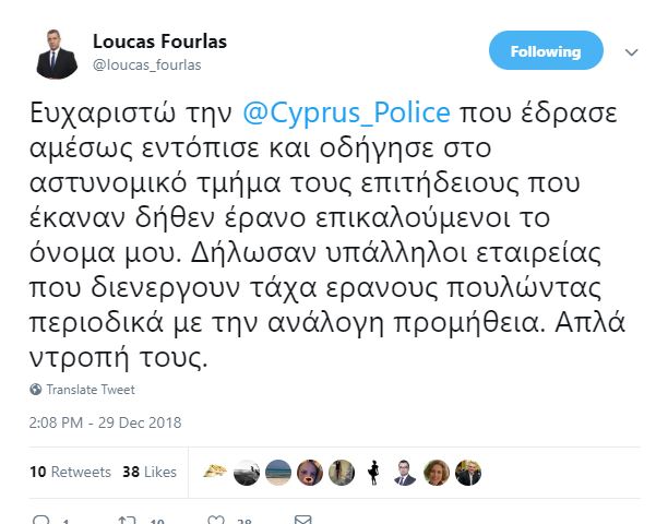 Σύμφωνα με νεότερη ενημέρωση από τον ίδιο τον Υπεύθυνο του Γραφείου Τύπου της Βουλής Λουκά Φουρλά μετά από άμεση επέμβαση της Αστυνομίας στην καταγγελία του εντοπίστηκαν οι «επιτήδειοι που έκαναν δήθεν έρανο επικαλούμενοι το όνομα» του.