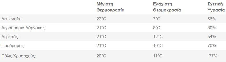 Η θάλασσα θα είναι λίγο ταραγμένη και παροδικά το απόγευμα, στα νότια παράλια, μέχρι ταραγμένη. Η θερμοκρασία θα ανέλθει γύρω στους 19 βαθμούς στο εσωτερικό, στα νότια και ανατολικά παράλια, γύρω στους 18 στα δυτικά και βόρεια παράλια και γύρω στους 9 βαθμούς στα ψηλότερα ορεινά.