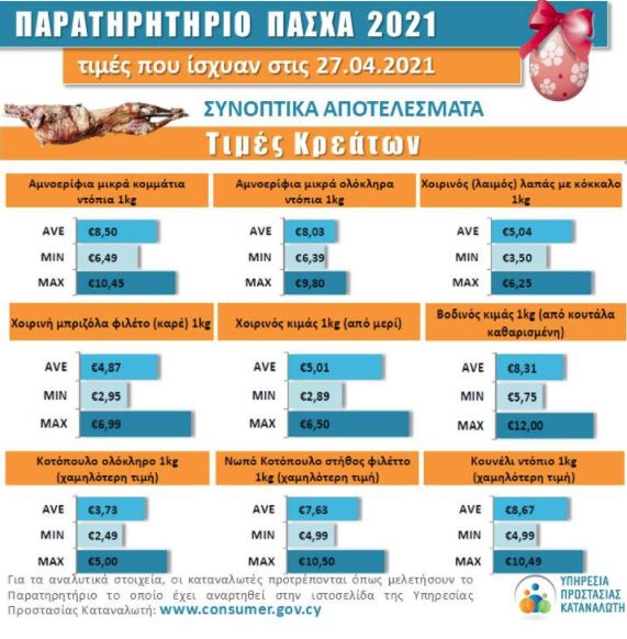 Με στόχο την καλύτερη πληροφόρηση των καταναλωτών, η Υπηρεσία Προστασίας Καταναλωτή έχει ολοκληρώσει έρευνα για συλλογή στοιχείων αναφορικά με τα επίπεδα τιμών λιανικής πώλησης νωπών κρεάτων και πασχαλινών εδεσμάτων, για τις τιμές που ίσχυαν στις 27 Απριλίου 2021.