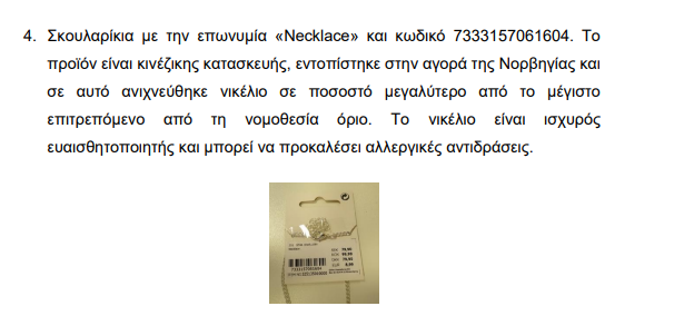 Προϊόντα με επικίνδυνες χημικές ουσίες τα οποία θεωρείται ότι περικλείουν κινδύνους για τους εργαζόμενους και τους καταναλωτές έχουν εντοπισθεί στην Ευρωπαϊκή αγορά. Το Τμήμα Επιθεώρησης Εργασίας του Υπουργείου Εργασίας, Πρόνοιας και Κοινωνικών Ασφαλίσεων διευκρινίζει ότι οι σχετικές πληροφορίες που ακολουθούν έχουν καταχωρηθεί στο Σύστημα Ταχείας Ανταλλαγής Πληροφοριών για Ασφάλεια Προϊόντων πλην τροφίμων (RAPEX) της Ευρωπαϊκής Ένωσης.