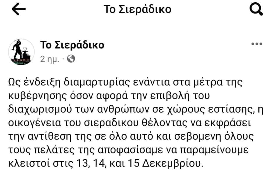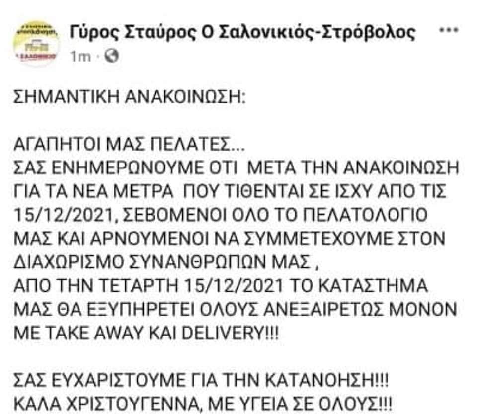 Ιδιοκτήτες υποστατικών και χώρων εστίασης εξέφρασαν την αντίθεσή τους με την εν λόγω απόφαση, γι’ αυτό και αποφάσισαν όπως λειτουργούν μόνο με delivery και take away, αφού δεν «θέλουν να διαχωρίσουν τους πολίτες σε εμβολιασμένους και ανεμβολίαστους».