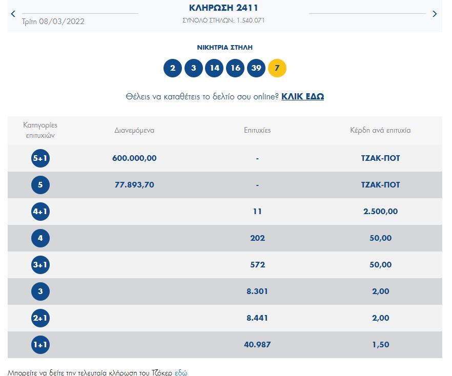 Δείτε τους τυχερούς αριθμούς εδώ.