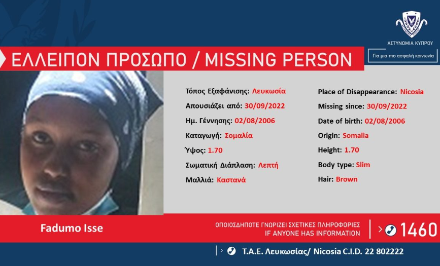 Η Αστυνομία ζητά πληροφορίες που μπορούν να βοηθήσουν στον εντοπισμό της FADUMO ISSE, 16 ετών, από τη Σομαλία, η οποία απουσιάζει από το χώρο διαμονής της στη Λευκωσία, από τις 30/09/2022.