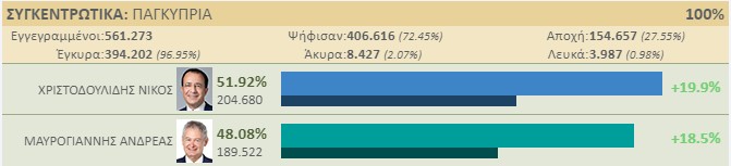 Ο νέος Πρόεδρος της Δημοκρατίας, Νίκος Χριστοδουλίδης, έλαβε συνολικά 204.680 ψήφους ή ποσοστό 51,92% και ο Ανδρέας Μαυρογιάννης 189.552 ψήφους ή ποσοστό 48,08%.