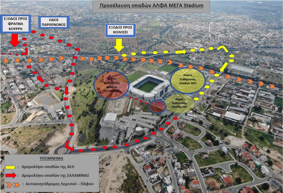 -Για την ομαλή προσέλευση και αποχώρηση των οπαδών της ΝΕΑΣ ΣΑΛΑΜΙΝΑΣ προς και από το στάδιο, καλούνται να κατευθυνθούν προς ΑΛΦΑΜΕΓΑ Stadium, δια μέσου του αυτοκινητόδρομου {Α6} προς Πάφο, έξοδο προς φράγμα Κούρρη και στη συνέχεια μέσω της οδού Παρθενώνος (1ο στρίψιμο δεξιά). Ακολούθως από την 1η έξοδο {αριστερά} του νέου κυκλικού κόμβου, κατεύθυνση προς το γήπεδο. Οι φίλαθλοι της ΝΕΑΣ ΣΑΛΑΜΙΝΑΣ μπορούν να σταθμεύσουν στους προκαθορισμένους χώρους του γηπέδου για τους φιλοξενούμενους.