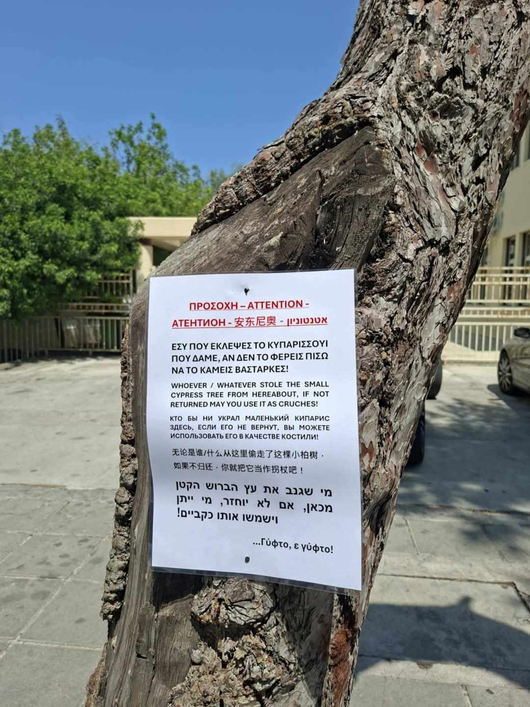 Η αφίσα, η οποία έχει γίνει social media, είναι γραμμένη σε πέντε γλώσσες και φαίνεται να απευθύνεται σε πρόσωπο το όποιο έκλεψε ένα… μικρό κυπαρισσάκι.