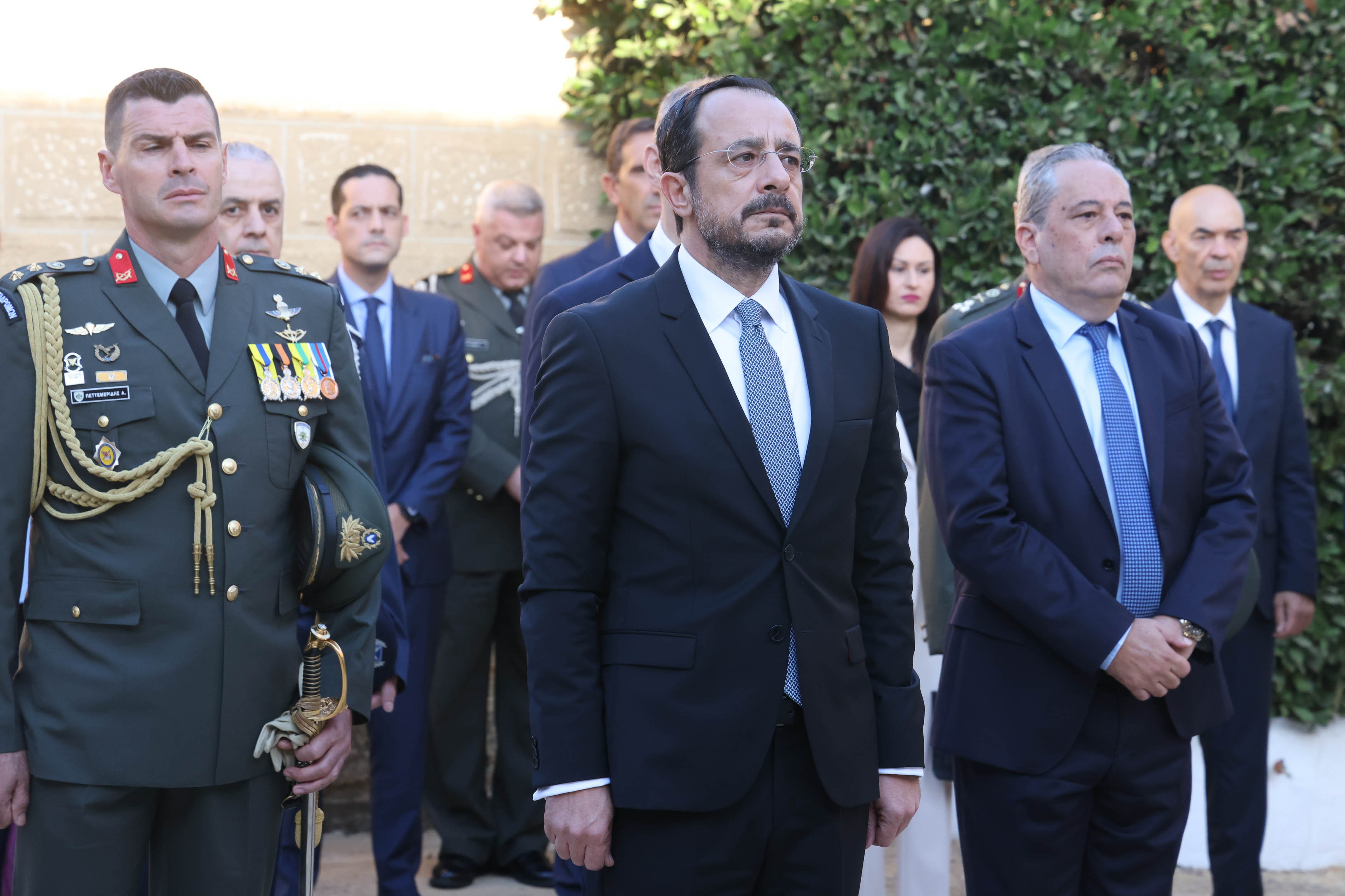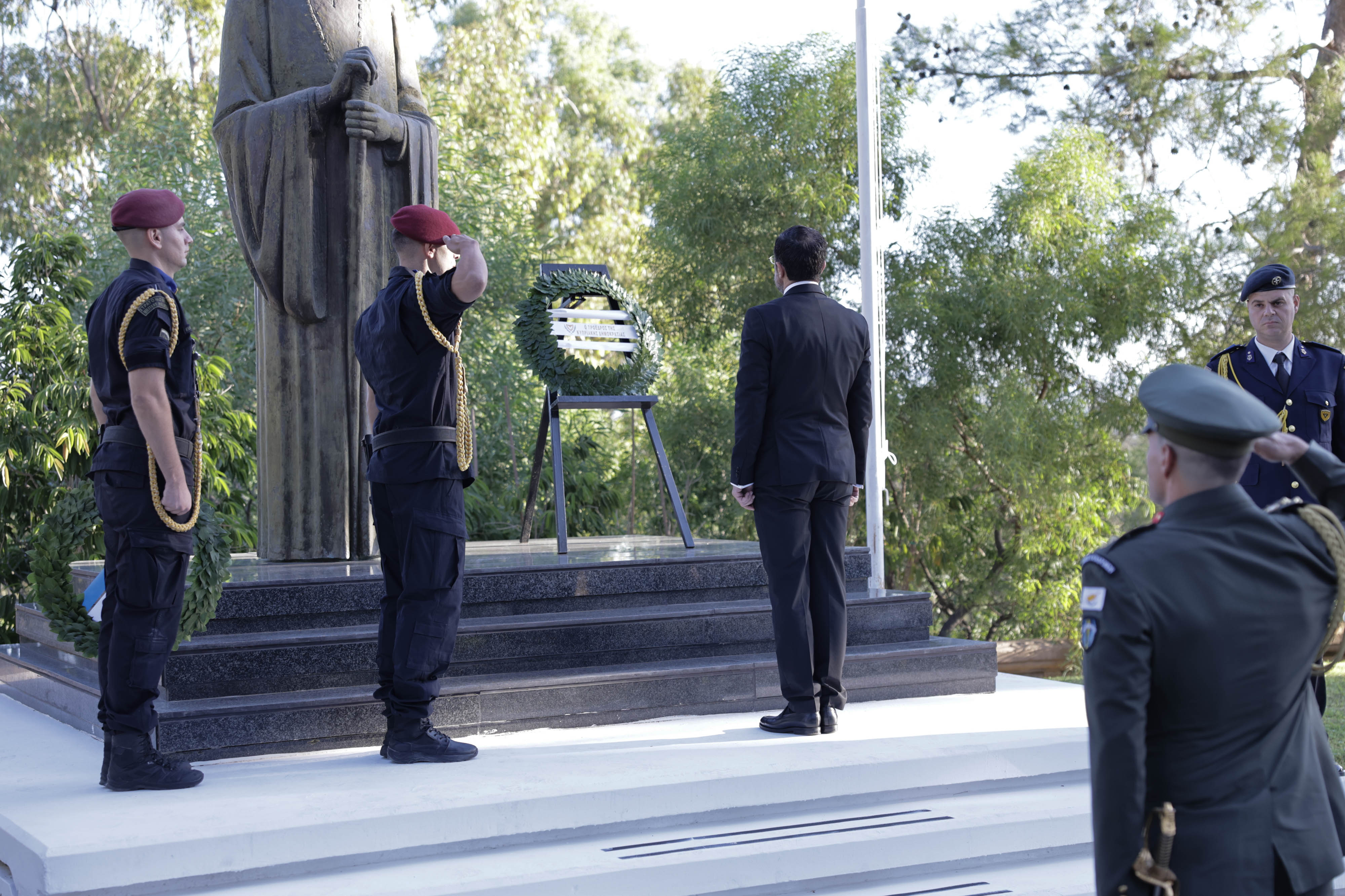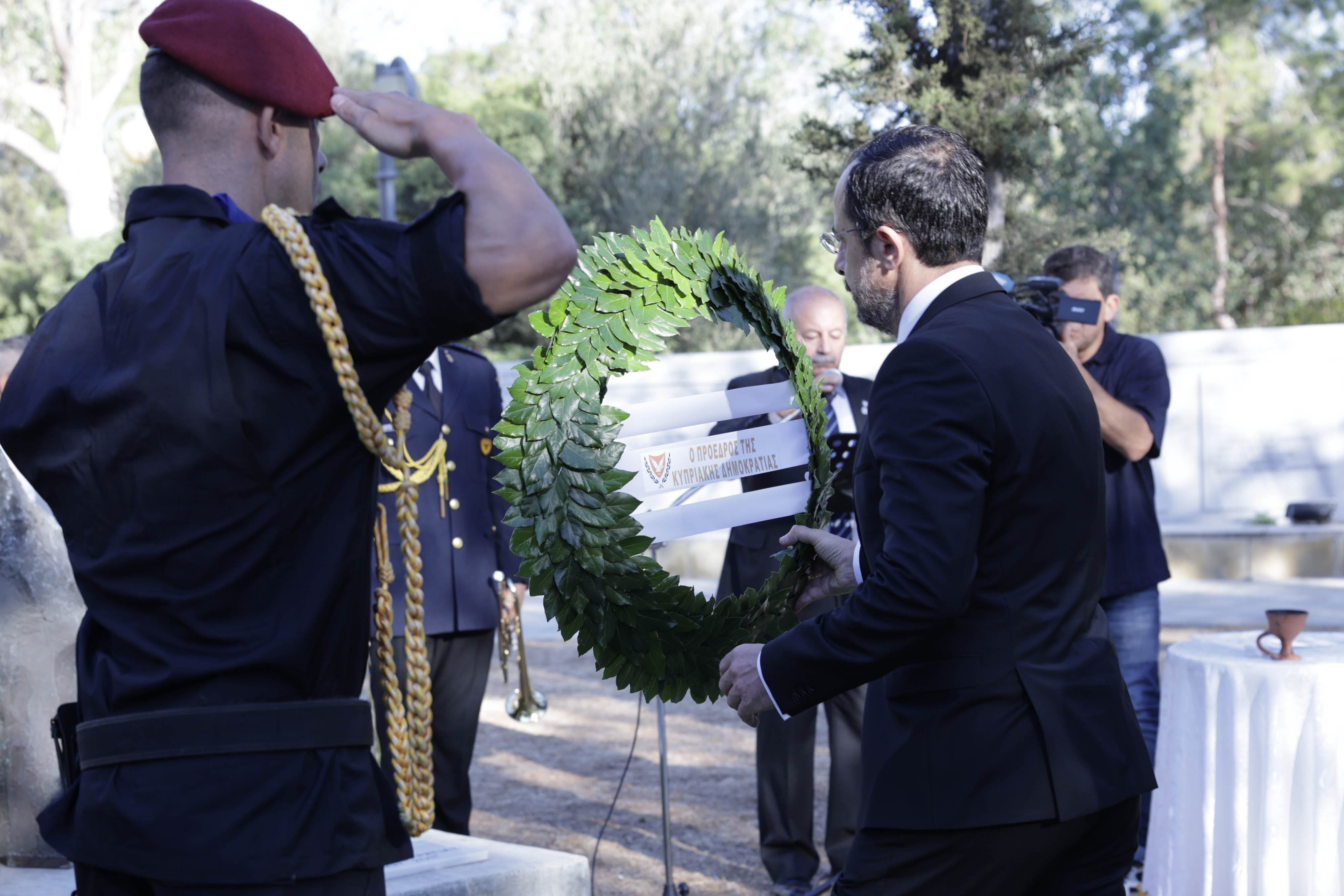 Στη συνέχεια ο Πρόεδρος Χριστοδουλίδης μετέβη στο Προεδρικό Μέγαρο, όπου κατέθεσε στεφάνι στον ανδριάντα του Εθνάρχη Μακαρίου Γ’, στον προαύλιο χώρο του Μεγάρου.