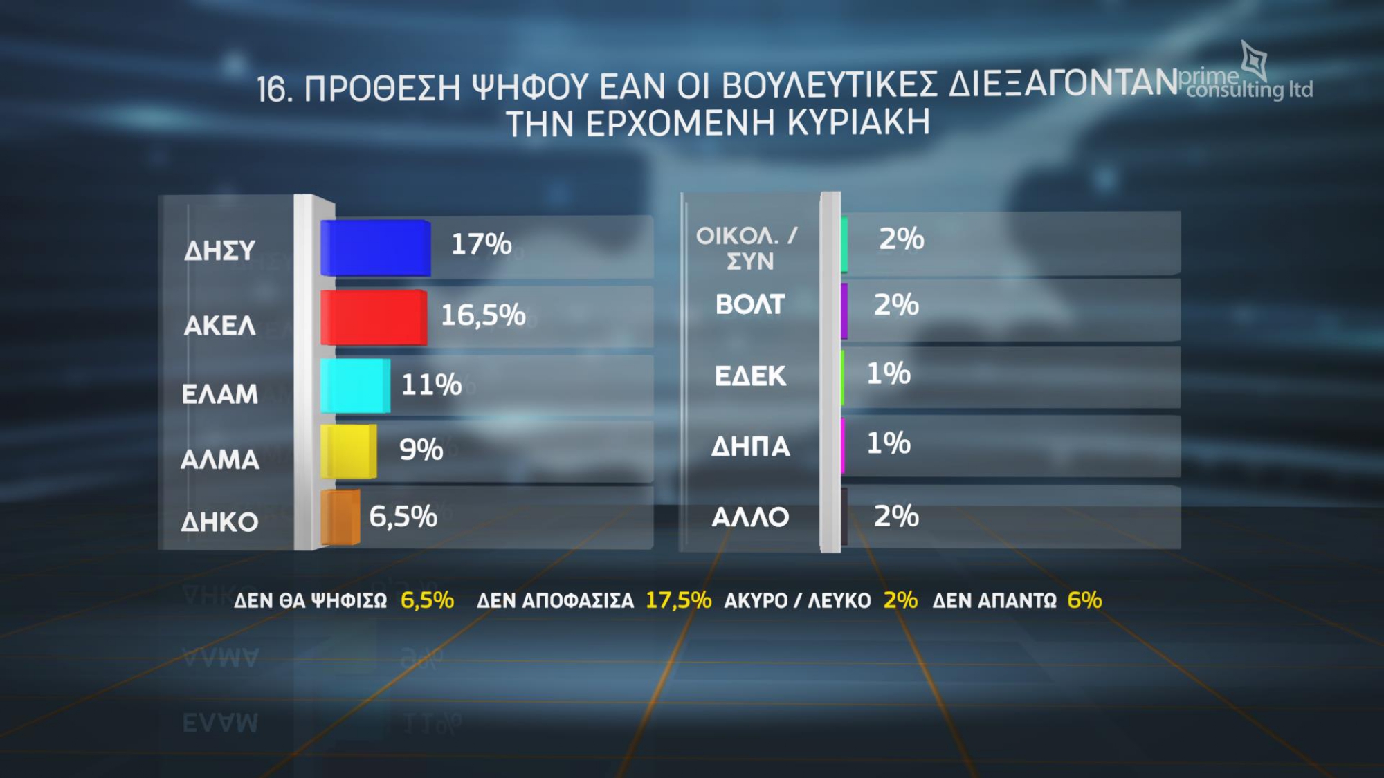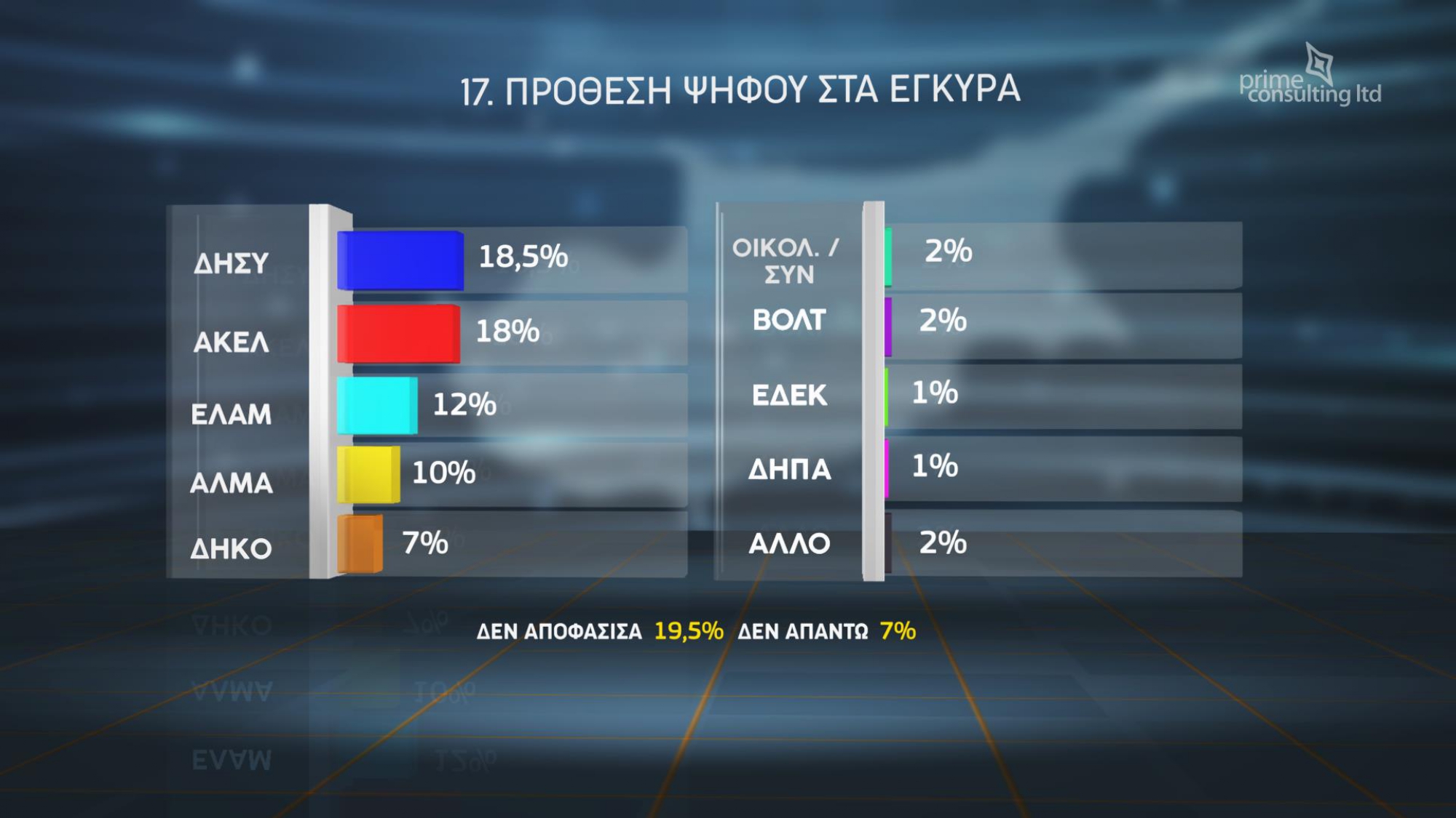 Εάν οι εκλογές ήταν την επόμενη Κυριακή πρώτο «κόμμα» βγαίνουν οι αναποφάσιστοι πολίτες με 17,5%. Στην κάρτα, πρώτος ο ΔΗΣΥ με 17%, ξοπίσω το ΑΚΕΛ με 16,5%, ανεβαίνει το ΕΛΑΜ τρίτο με 11% και το μεγάλο ΑΛΜΑ του Οδυσσέα Μιχαηλίδη τέταρτο με 9%.