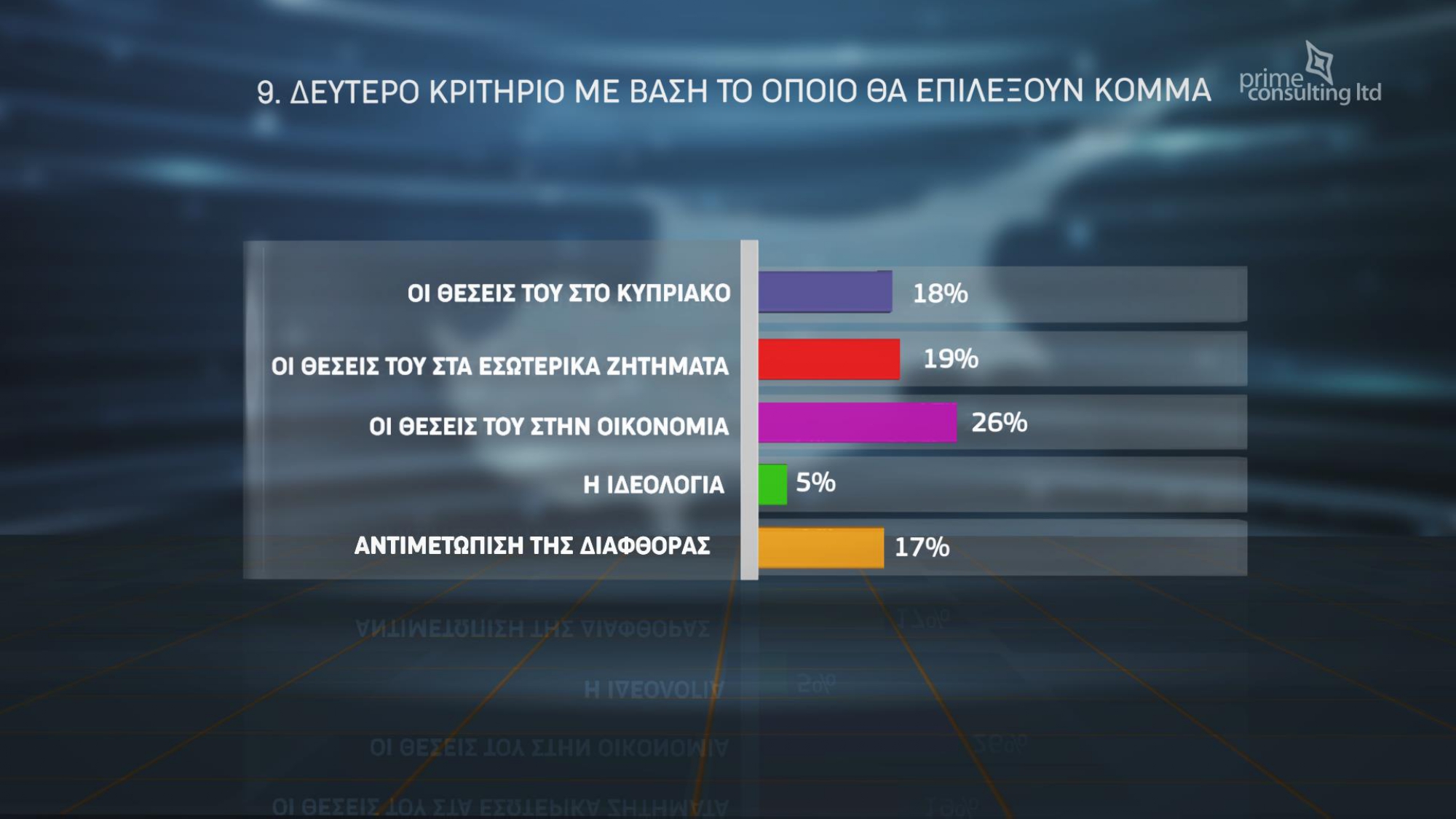 Στην κορυφή των κριτηρίων με τα οποία θα επιλέξουν κόμμα οι πολίτες βρίσκεται το Κυπριακό ενώ ακολουθούν η αντιμετώπιση της διαφθοράς και οι θέσεις του κόμματος στην οικονομία.