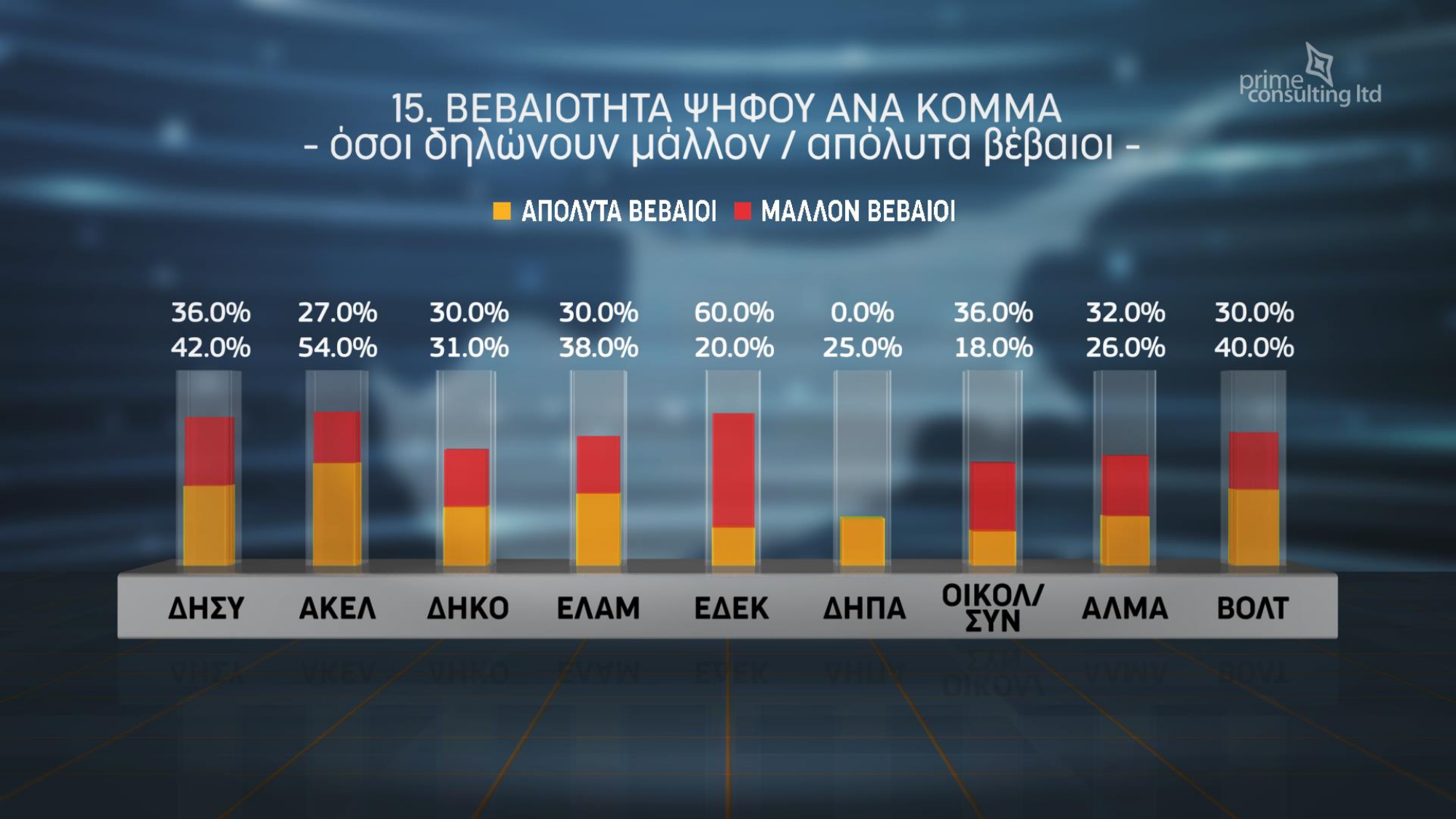 Μεγάλος χαμένος των επερχόμενων Βουλευτικών φαίνεται να είναι η ΔΗΠΑ με μόλις το 25% των ψηφοφόρων της να δηλώνουν ότι σίγουρα θα την στηρίξουν ξανά. Μεγάλη η αβεβαιότητα στην ΕΔΕΚ ενώ παραμένουν ισχυροί ΑΚΕΛ, ΔΗΣΥ και ΕΛΑΜ.