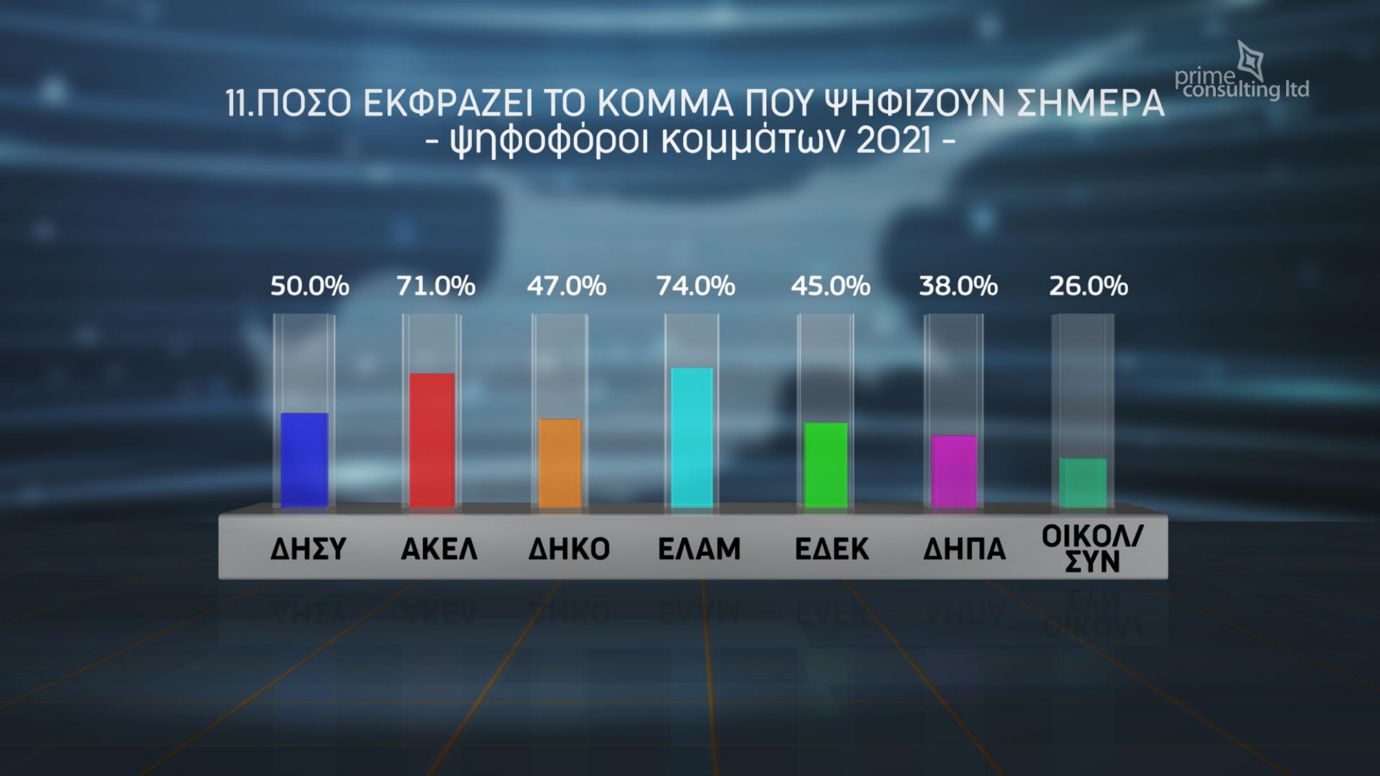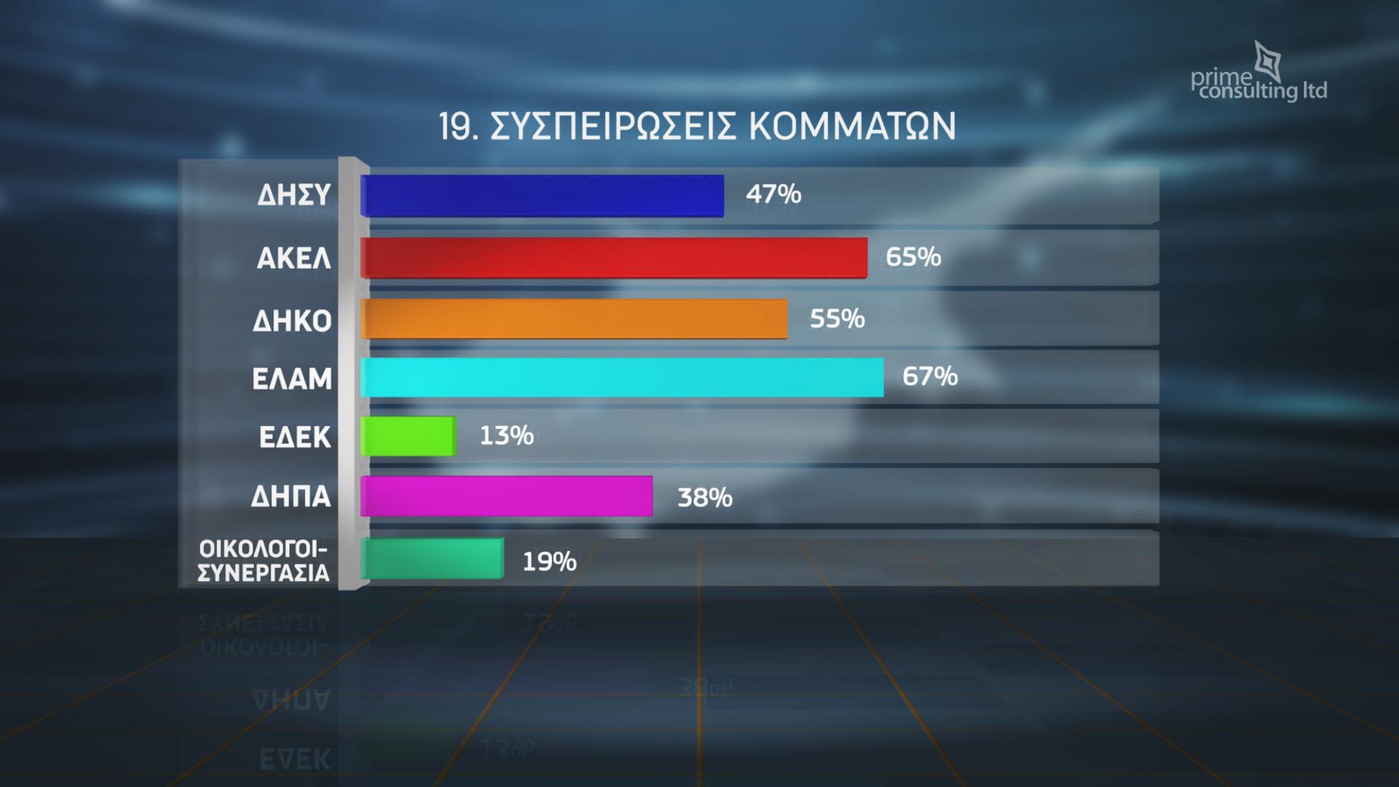 Ίδια εικόνα και στην κάρτα με τη συσπείρωση των κομμάτων. Την υψηλότερη συσπείρωση παρουσιάζει το ΕΛΑΜ με 67% και ακολουθεί το ΑΚΕΛ με 65%. Στα υψηλά το ΔΗΚΟ με 55%. Ανησυχία στις τάξεις του ΔΗΣΥ με τη συσπείρωση στο 47%.