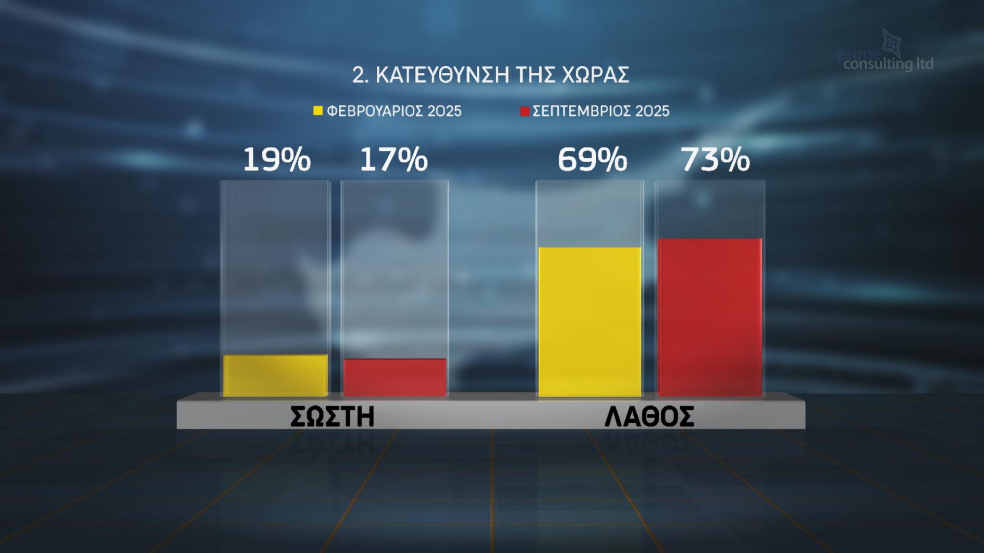 Αποκαρδιωτικά είναι τα αποτελέσματα για την κατεύθυνση που κινείται η χώρα με το 73% να σημειώνει ότι βρισκόμαστε στον λάθος δρόμο, παρουσιάζοντας μάλιστα αύξηση 4% από τον περασμένο Φεβρουάριο.