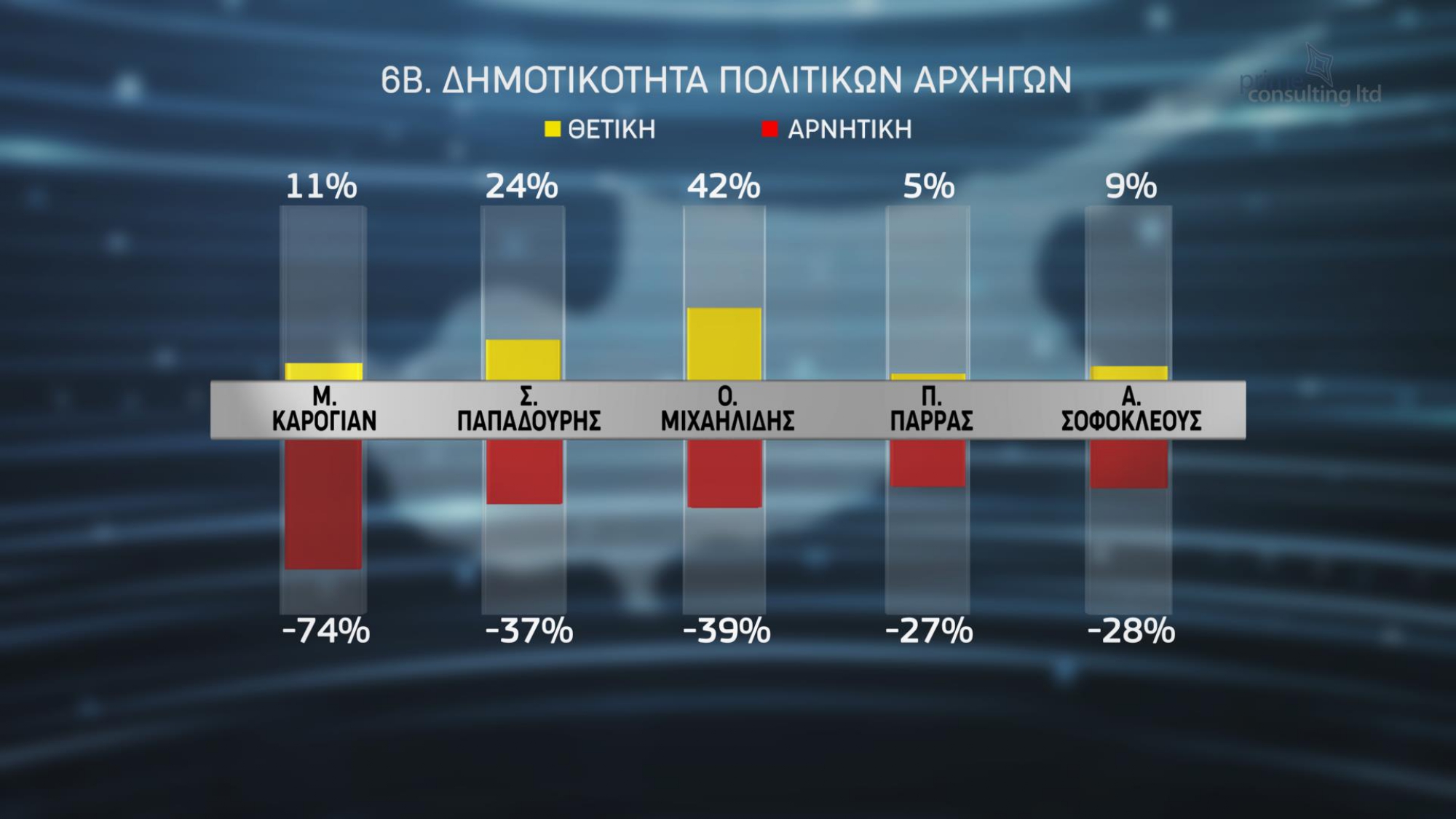 Από τους πολιτικούς αρχηγούς, δημοφιλέστερος είναι ο Οδυσσέας Μιχαηλίδης με 42% ενώ ακολουθούν η Πρόεδρος του ΔΗΣΥ, Αννίτα Δημητρίου με 34% και λίγο πιο πίσω με 30% ο ΓΓ του ΑΚΕΛ, Στέφανος Στεφάνου. Αξιοσημείωτο το γεγονός ότι όλοι οι πολιτικοί αρχηγοί έχουν σημαντική αρνητική εικόνα με το μεγαλύτερο ποσοστό να καταλαμβάνει ο Πρόεδρος της ΔΗΠΑ, Μάριος Καρογιάν (-74%) και το μικρότερο ο Συν-πρόεδρος του Volt Κύπρου, Πάνος Παρράς (-27%).