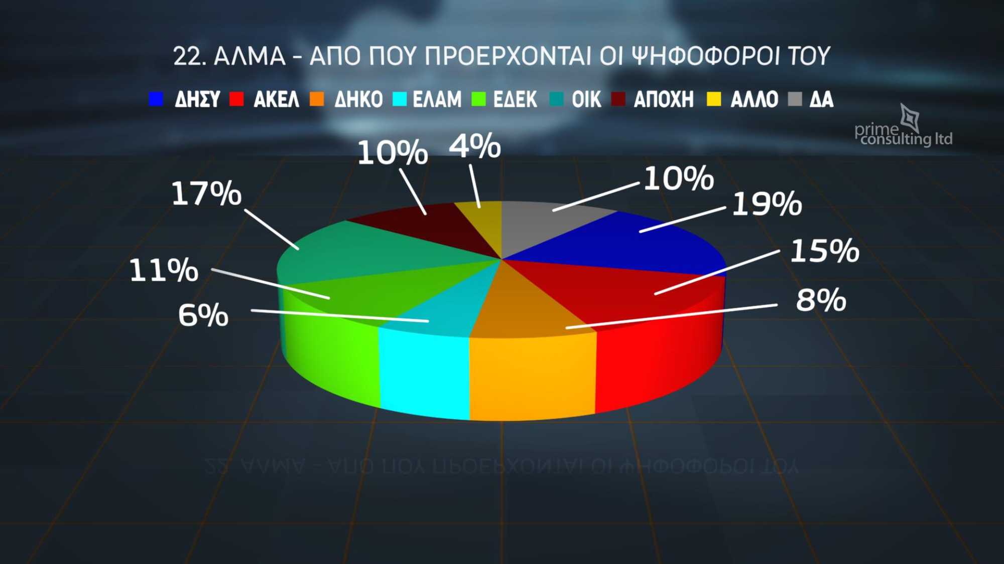 Σε ξεχωριστή κάρτα, φαίνεται ότι οι ψηφοφόροι του ΑΛΜΑ προέρχονται 19% από ΔΗΣΥ, 17% από ΕΔΕΚ, 15% από ΑΚΕΛ και ένα πολύ σημαντικό 10% από την αποχή.