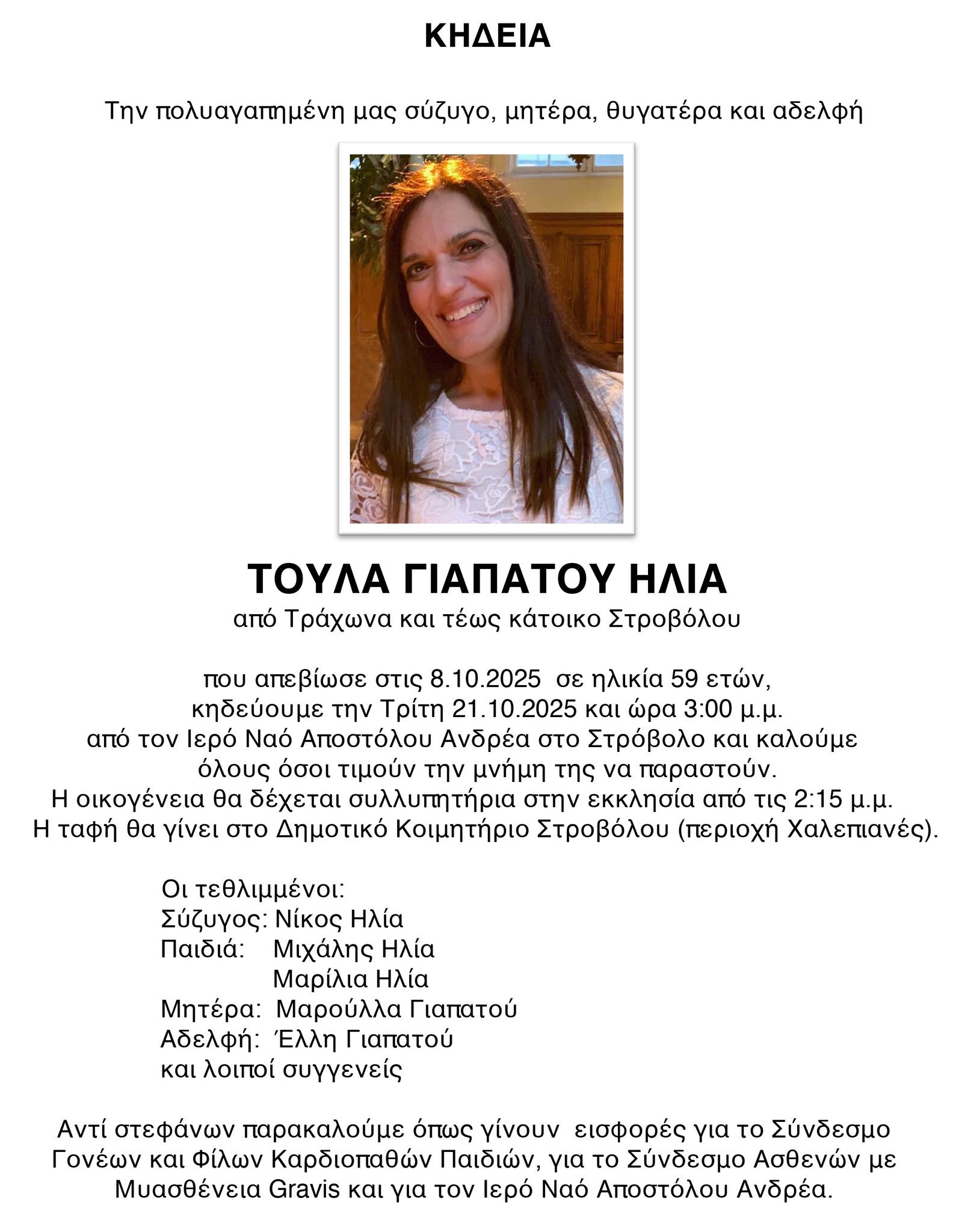 Θλίψη σκόρπισε η είδηση του θανάτου της Τούλας Γιαπάτου Ηλία, από τον Τράχωνα και τέως κάτοικο Στροβόλου, η οποία απεβίωσε στις 8 Οκτωβρίου 2025 σε ηλικία 59 ετών.