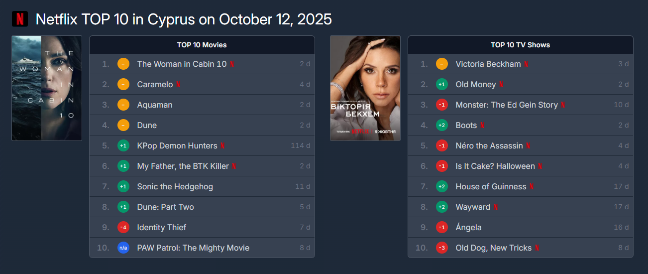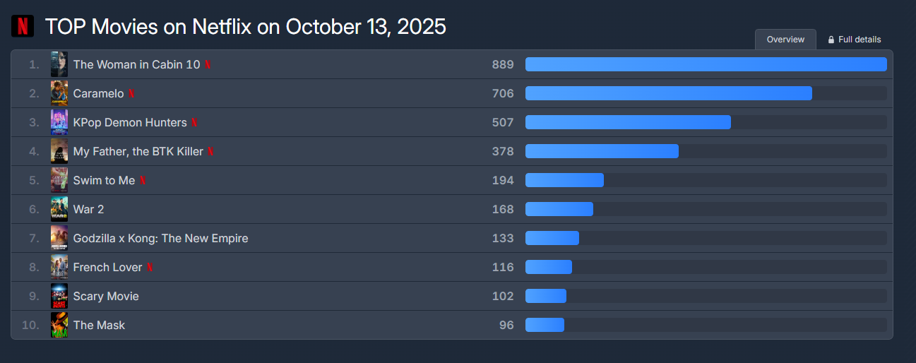 Σύμφωνα με τον ιστότοπο flixpatrol, στην κορυφή των charts του Netflix ανά το Παγκόσμιο στα top 5 των ταινιών βρίσκονται το «The Woman in Cabin 10», το «Caramelo», το «KPop Demon Hunters», το «My father, the BTK Killer» και το «Swim to Me» ενώ στις πρώτες πέντε αγαπημένες σειρές βρίσκονται το «Monster: The Ed Gein Story», το «Old Money», το «Boots» και το «Nero the Assassin».