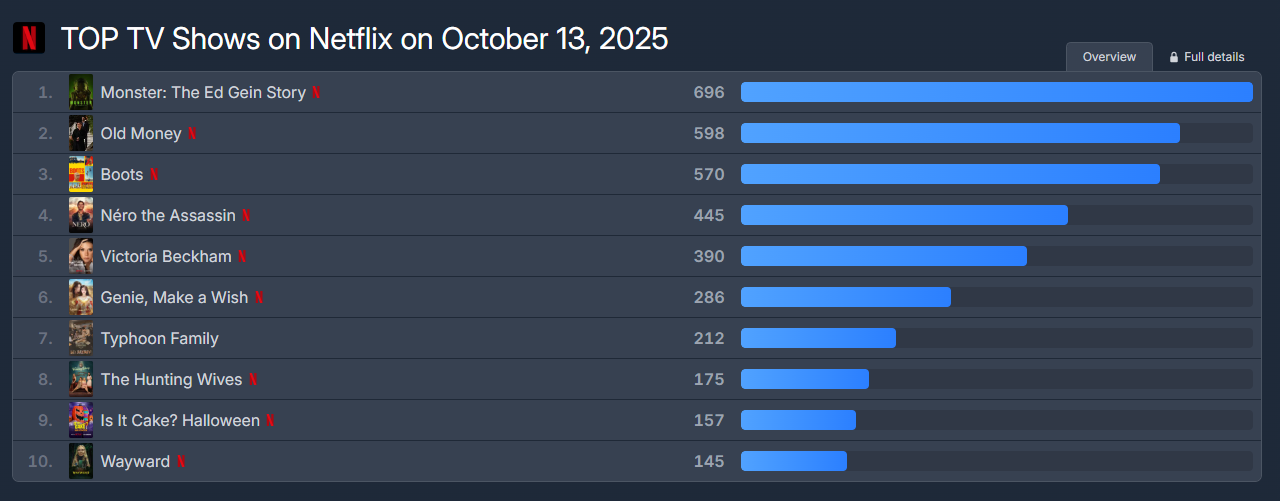 Όπως παρατηρούμε η πρώτη σειρά διατηρεί τη θέση της ενώ στις υπόλοιπες βλέπουμε σκαμπανεβάσματα. Συγκεκριμένα, η σειρά «old money» ανέβηκε μια θέση και η σειρά «Boots» ανέβηκε 2 θέσεις. Από την άλλη οι σειρές Monster: The Ed Gein Story και Nero the Assassin έπεσαν από μια θέση αντίστοιχα.