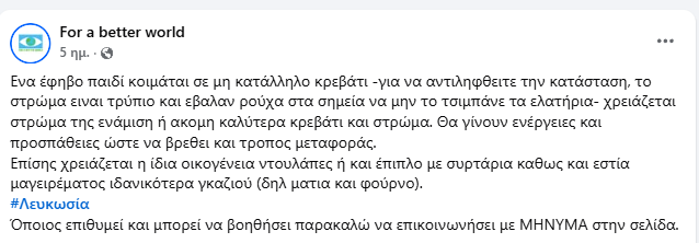 Μια ακόμη συγκλονιστική ανάρτηση από την εθελοντική ομάδα «For a better world» φέρνει στο φως την πραγματικότητα που βιώνει ένας έφηβος στη Λευκωσία, ο οποίος κοιμάται σε μη κατάλληλο κρεβάτι με τρύπιο στρώμα.