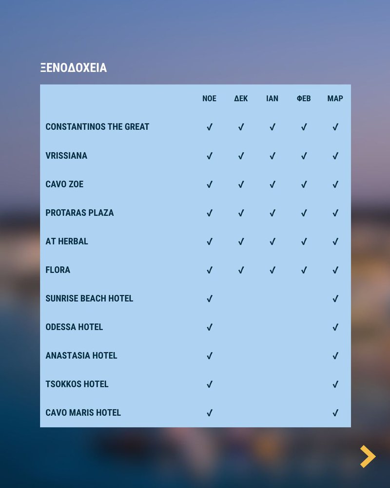 Αντίστοιχα, ξενοδοχεία όπως τα Sunrise Beach Hotel, Odessa Hotel, Anastasia Hotel, Tsokkos Hotel και Cavo Maris Hotel παραμένουν ανοιχτά, διασφαλίζοντας ότι ο Πρωταράς παραμένει ζωντανός και φιλόξενος προορισμός και τους πιο ήσυχους μήνες του χρόνου.
