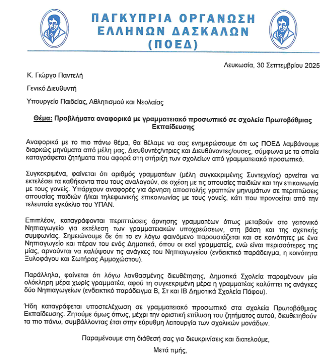 Η παρέμβαση του Υπουργείου ακολούθησε επιστολή της ΠΟΕΔ (Παγκύπρια Οργάνωση Ελλήνων Δασκάλων), ημερομηνίας 30 Σεπτεμβρίου 2025, στην οποία γινόταν λόγος για σοβαρά προβλήματα στη στελέχωση και τη λειτουργία πολλών σχολείων, με αποτέλεσμα, όπως αναφέρεται, «να παρατηρούνται φαινόμενα σχολείων χωρίς γραμματείς, καθυστερήσεις σε διαδικασίες επικοινωνίας με γονείς και καθυστερημένες απαντήσεις σε θέματα καθημερινής λειτουργίας».