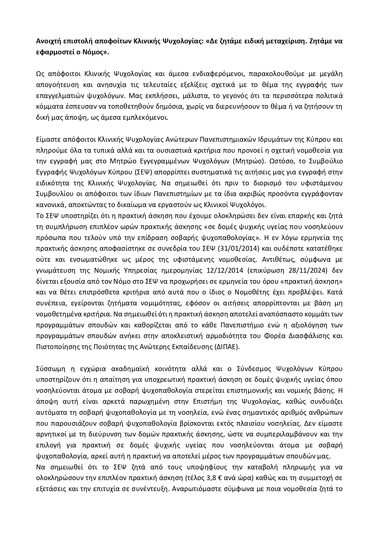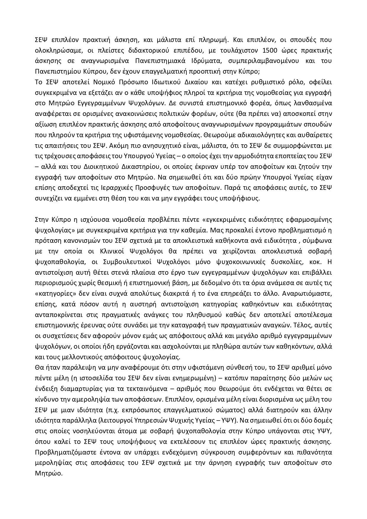 Το ΣΕΨ απορρίπτει τις αιτήσεις των αποφοίτων επικαλούμενο ανεπαρκή πρακτική άσκηση, απαιτώντας επιπλέον ώρες πρακτικής «σε δομές νοσηλείας σοβαρής ψυχοπαθολογίας». Οι απόφοιτοι υποστηρίζουν, ωστόσο, ότι αυτή η απαίτηση δεν προβλέπεται από τον Νόμο.