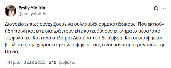 Η Έμιλυ Γιολίτη μας έχει συνηθίσει στα αιχμηρά σχόλια στο «X», ειδικά για την επικαιρότητα και ούτε αυτή την φορά απογοητεύει.