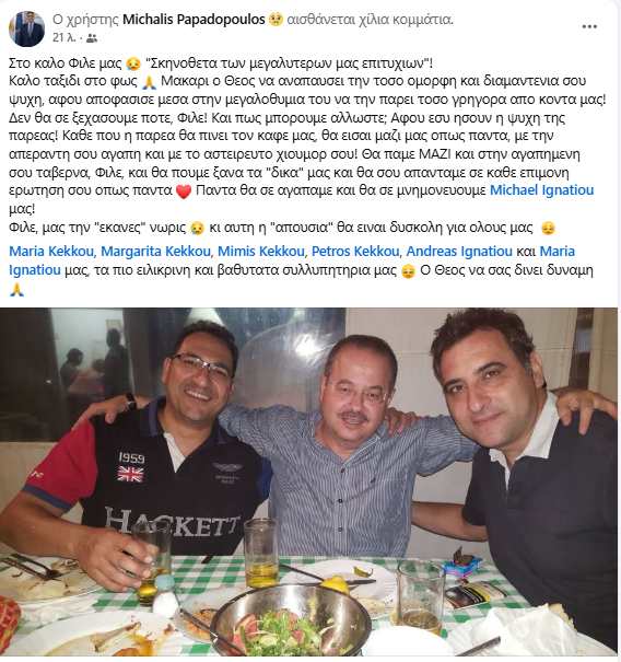 Δεν θα σε ξεχασουμε ποτε, Φιλε! Και πως μπορουμε αλλωστε; Αφου εσυ ησουν η ψυχη της παρεας! Καθε που η παρεα θα πινει τον καφε μας, θα εισαι μαζι μας οπως παντα, με την απεραντη σου αγαπη και με το αστειρευτο χιουμορ σου! Θα παμε ΜΑΖΙ και στην αγαπημενη σου ταβερνα, Φιλε, και θα πουμε ξανα τα "δικα" μας και θα σου απανταμε σε καθε επιμονη ερωτηση σου οπως παντα .Παντα θα σε αγαπαμε και θα σε μνημονευουμε Μιχάλη Ιγνατίου μας!