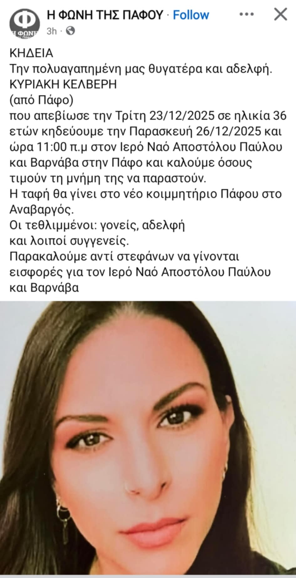 Η κηδεία της θα γίνει την Παρασκευή 26/12/2025 και ώρα 11:00 π.μ στον Ιερό Ναό Αποστόλου Παύλου και Βαρνάβα στην Πάφο.
