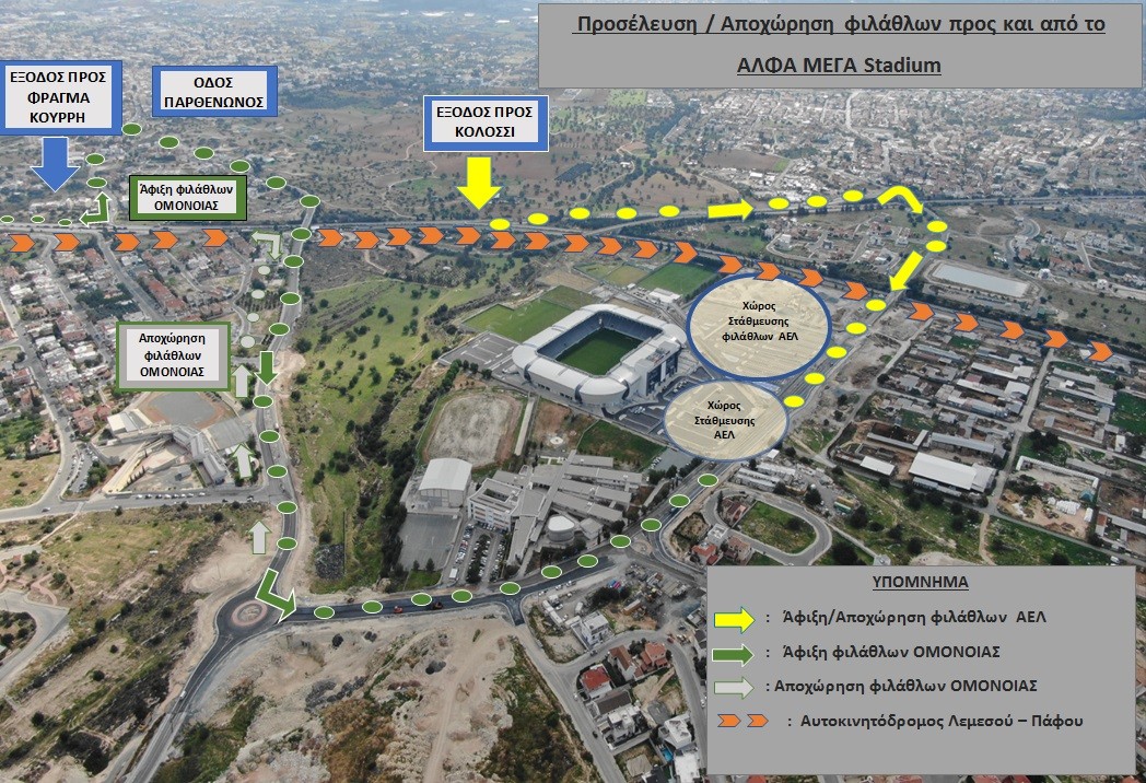 Για την ομαλή προσέλευση και αποχώρηση τους προς και από το στάδιο, οι οπαδοί της ομάδας της ΟΜΟΝΟΙΑΣ καλούνται να κατευθυνθούν προς το ΑΛΦΑΜΕΓΑ Stadium, μέσω του αυτοκινητόδρομου προς Πάφο, να ακολουθήσουν την έξοδο προς Φράγμα Κούρρη και στη συνέχεια μέσω της οδού Παρθενώνος (1ο στρίψιμο δεξιά). Ακολούθως από την 1η έξοδο (αριστερά) του νέου κυκλικού κόμβου, να κατευθυνθούν προς το στάδιο.