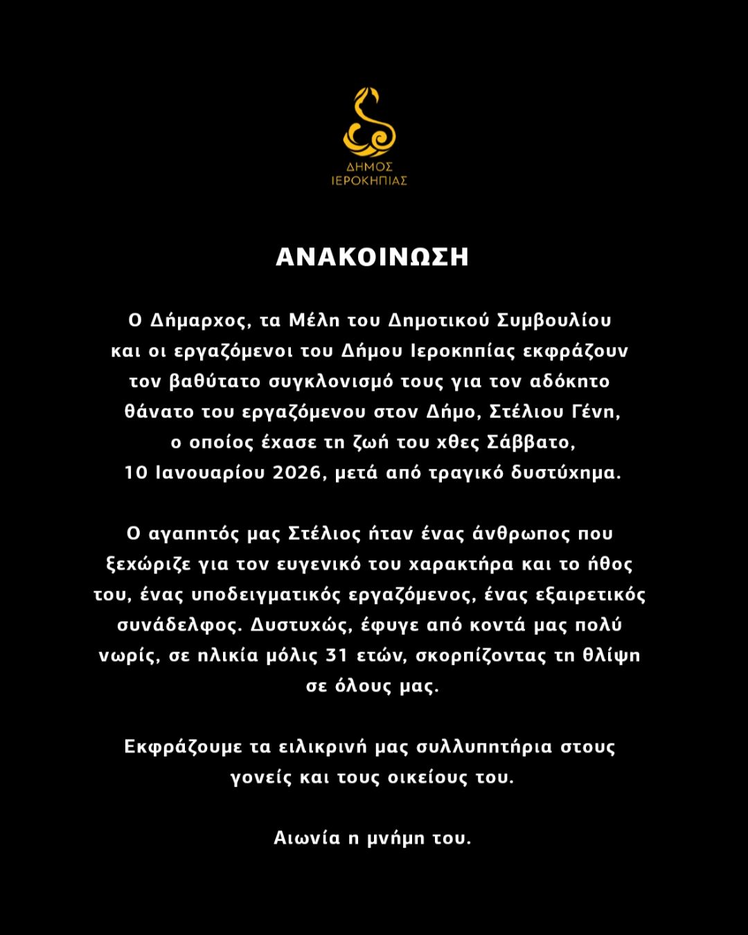 Ο Δήμαρχος, τα μέλη του Δημοτικού Συμβουλίου και οι εργαζόμενοι του Δήμου εκφράζουν τα ειλικρινή και θερμά τους συλλυπητήρια προς την οικογένεια και τους οικείους του, συμμεριζόμενοι τον αβάσταχτο πόνο τους για την απώλεια του αγαπημένου τους προσώπου.