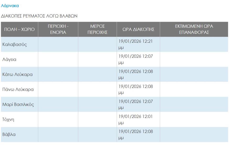 Διακοπή ρεύματος σημειώθηκε από το μεσημέρι σε αρκετές περιοχές της επαρχίας Λάρνακας.