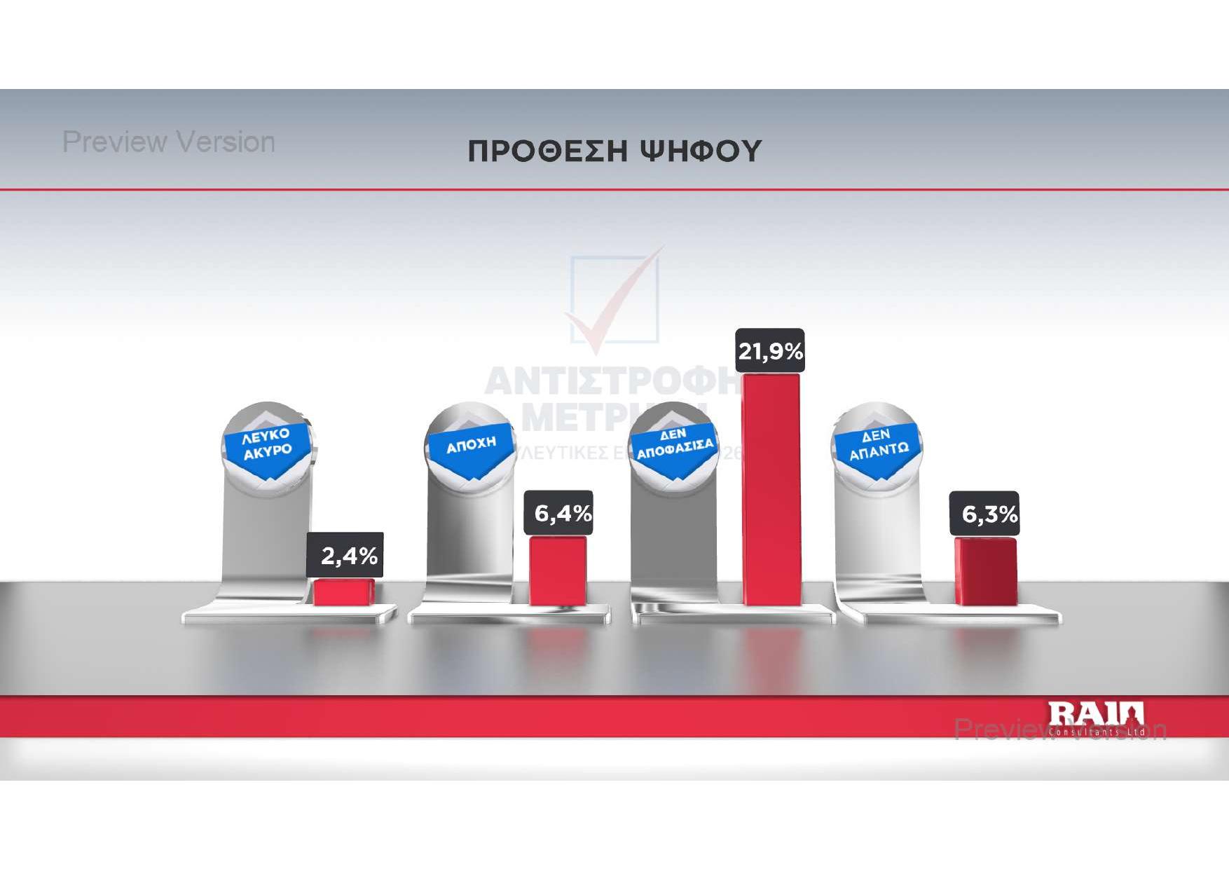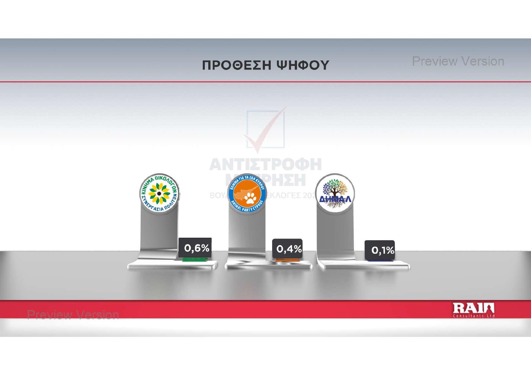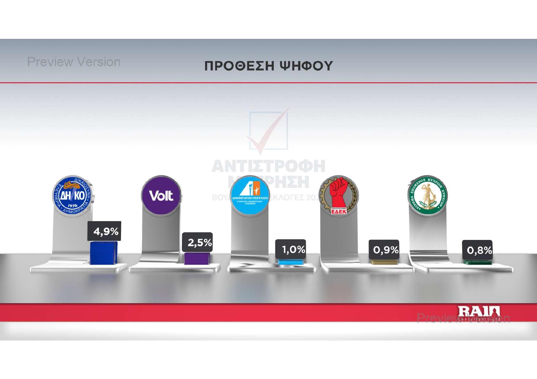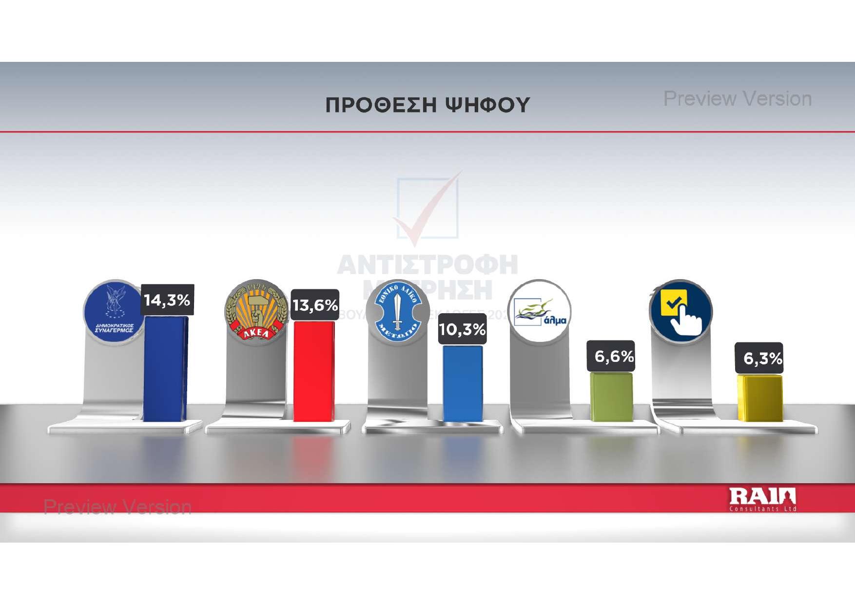 Η πρόθεση ψήφου αναδεικνύει ως πρώτο κόμμα τον Δημοκρατικό Συναγερμό με διαφορά μιας και πλέον ποσοστιαίας μονάδας από το ΑΚΕΛ. Την τρίτη θέση φαίνεται να «κλειδώνει» το ΕΛΑΜ και ακολουθούν Άλμα και Άμεση Δημοκρατία, με μικρή διαφορά μεταξύ τους.