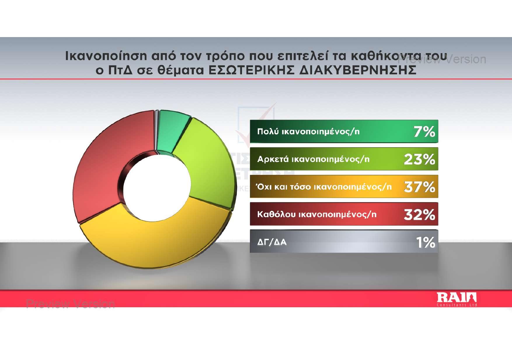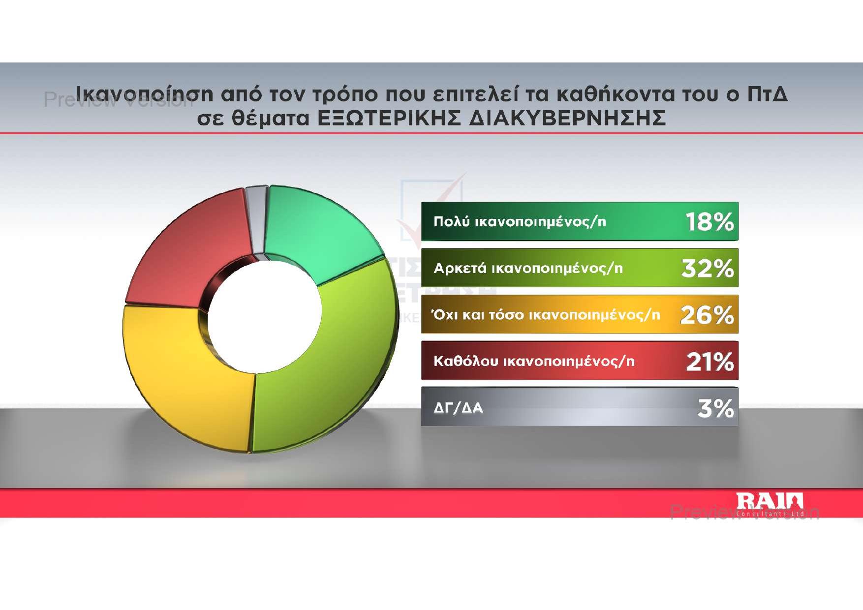 Η εικόνα του Προέδρου της Δημοκρατίας εμφανίζεται διχοτομημένη, καθώς οι πολίτες αξιολογούν με εντελώς διαφορετικά κριτήρια το έργο του εντός και εκτός συνόρων. Ενώ η ικανοποίηση για την εξωτερική πολιτική αγγίζει το 50%, η εσωτερική διακυβέρνηση αποτελεί τη μεγάλη «πληγή» του λόφου, με το 69% των ερωτηθέντων να δηλώνουν δυσαρεστημένοι.
