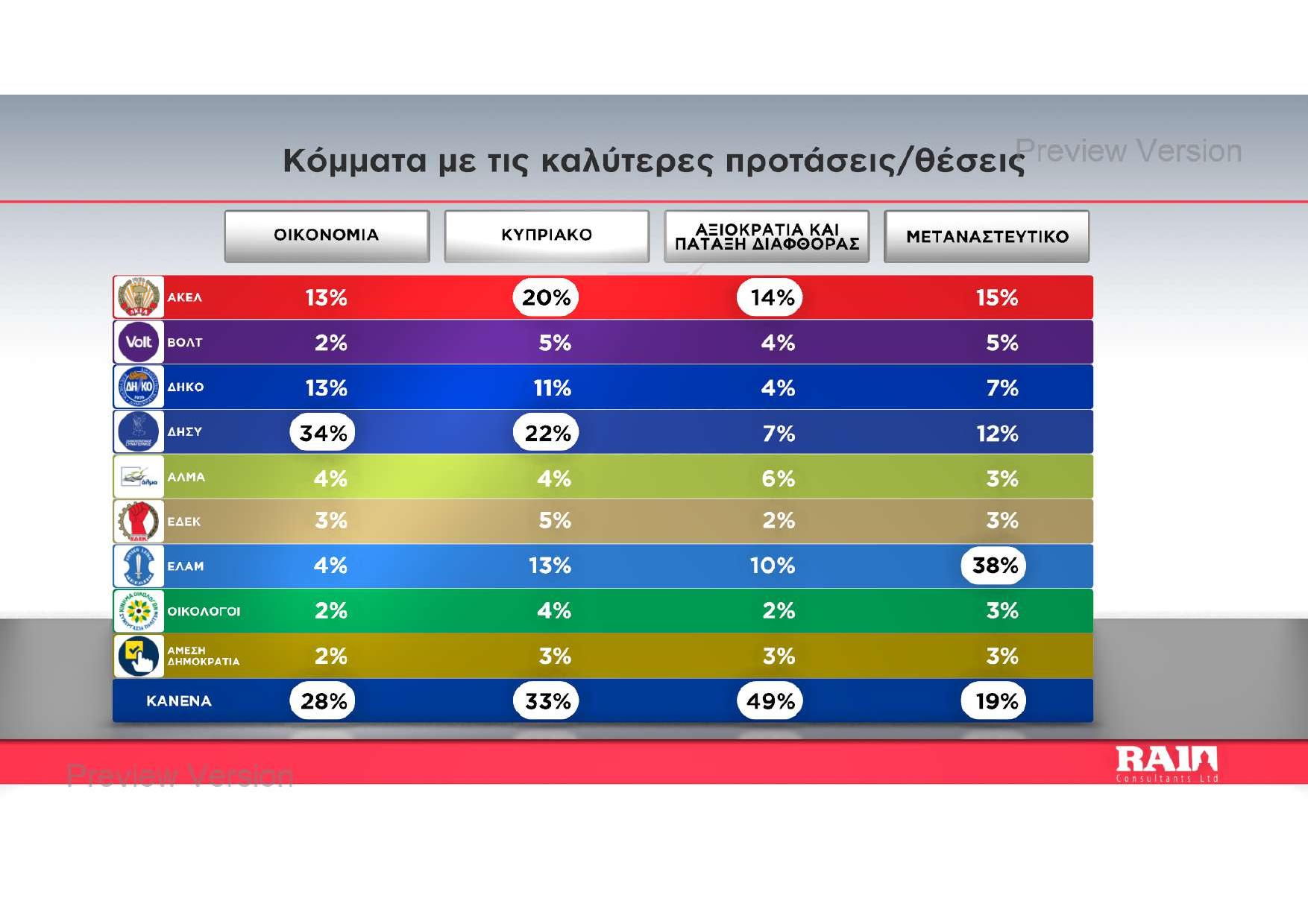 Στο πεδίο των συγκεκριμένων πολιτικών θεμάτων, ο Δημοκρατικός Συναγερμός διατηρεί τα πρωτεία στην οικονομία με 34%, ενώ το ΑΚΕΛ εμφανίζεται ως η επικρατέστερη δύναμη στους χειρισμούς για το Κυπριακό. Την ίδια στιγμή, η θεματολογία του μεταναστευτικού φαίνεται να ενισχύει το ΕΛΑΜ, το οποίο συγκεντρώνει το 38% των προτιμήσεων ως προς την καταλληλότητα των προτάσεών του. Παρά τη γενικευμένη απογοήτευση, το ενδιαφέρον για τις Βουλευτικές Εκλογές του 2026 παραμένει σε υψηλά επίπεδα, με το 67% να δηλώνει ότι σκοπεύει να παρακολουθήσει στενά τις εξελίξεις.