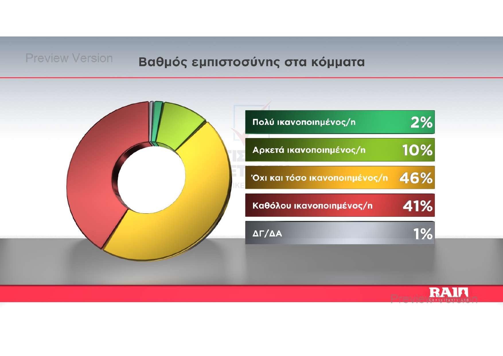 Η διαφθορά και η έλλειψη αξιοκρατίας αναδεικνύονται ως τα μεγαλύτερα προβλήματα, με το πολιτικό σύστημα να αδυνατεί να πείσει για τις προθέσεις του. Είναι χαρακτηριστικό πως στην ερώτηση για το ποιο κόμμα έχει τις καλύτερες προτάσεις για την πάταξη της διαφθοράς, η απάντηση «Κανένα» κυριαρχεί με το συντριπτικό 49%. Την ίδια στιγμή, το 87% των πολιτών δηλώνει ελάχιστα ή καθόλου ικανοποιημένο από τη συνολική στάση και το έργο των πολιτικών κομμάτων, μια διαπίστωση που χτυπά καμπανάκι για την αξιοπιστία του κοινοβουλευτισμού.