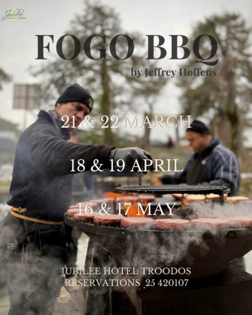 Συγκεκριμένα, το FOGO BBQ ανάβει φουκού στο Jubilee Hotel Troodos στις 21 & 22 Μαρτίου, 18 & 19 Απριλίου και 16 & 17 Μαΐου, προσφέροντας ζουμερά, άψογα ψημένα steaks, λαχταριστά burgers και όλα όσα έχουν καθιερώσει τη χαρακτηριστική υπογραφή FOGO ως εμπειρία που αξίζει να ζήσεις.