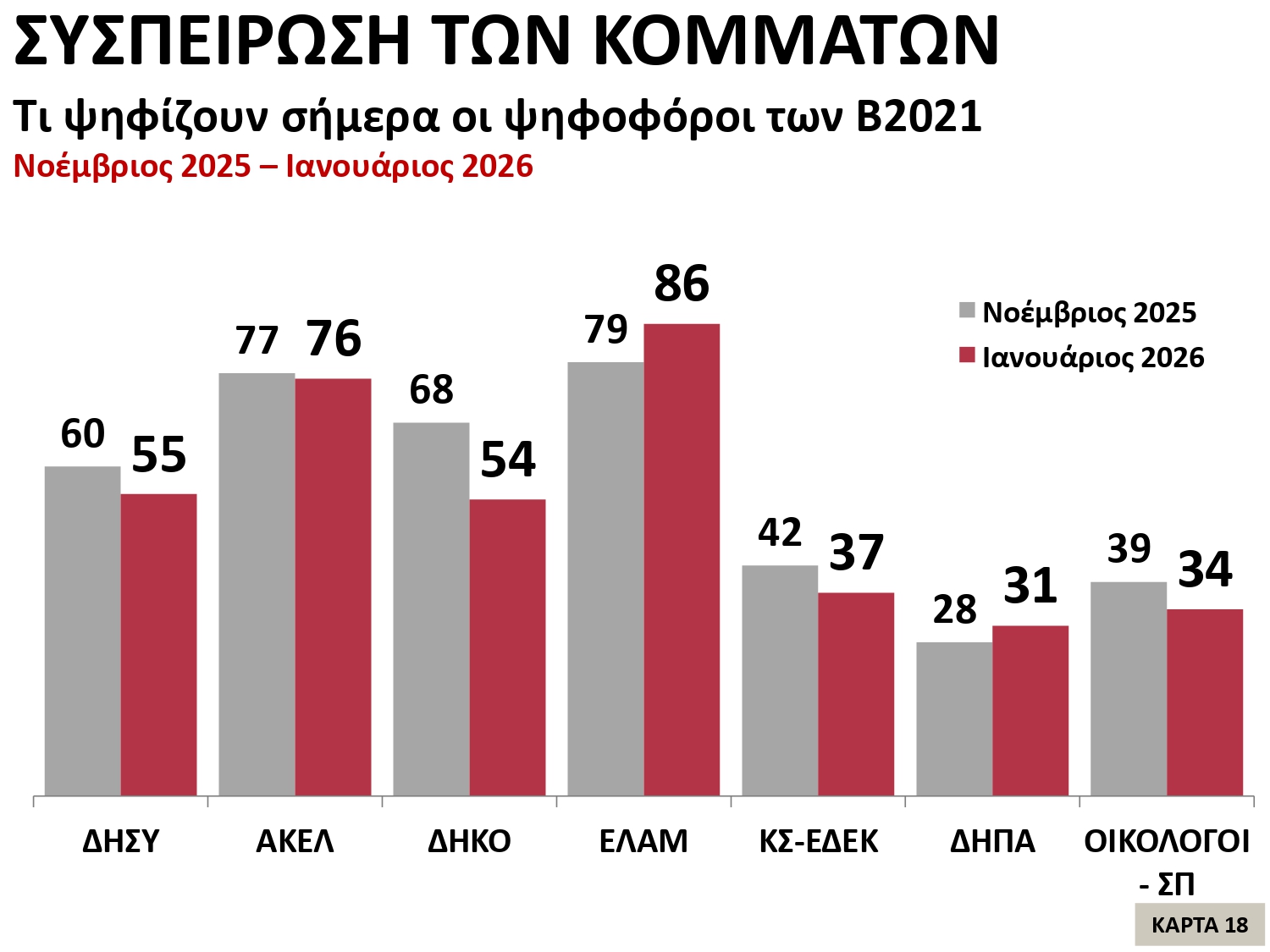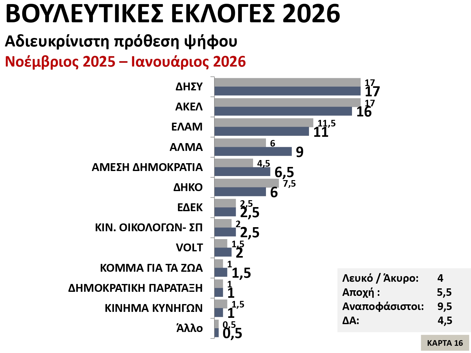 Παράλληλα, καταγράφεται κατακερματισμός της ψήφου προς μικρότερα και νέα κόμματα, καθώς και υψηλό ποσοστό αναποφάσιστων, στοιχείο που υποδηλώνει ρευστό εκλογικό σώμα και ανοιχτή εκλογική έκβαση.