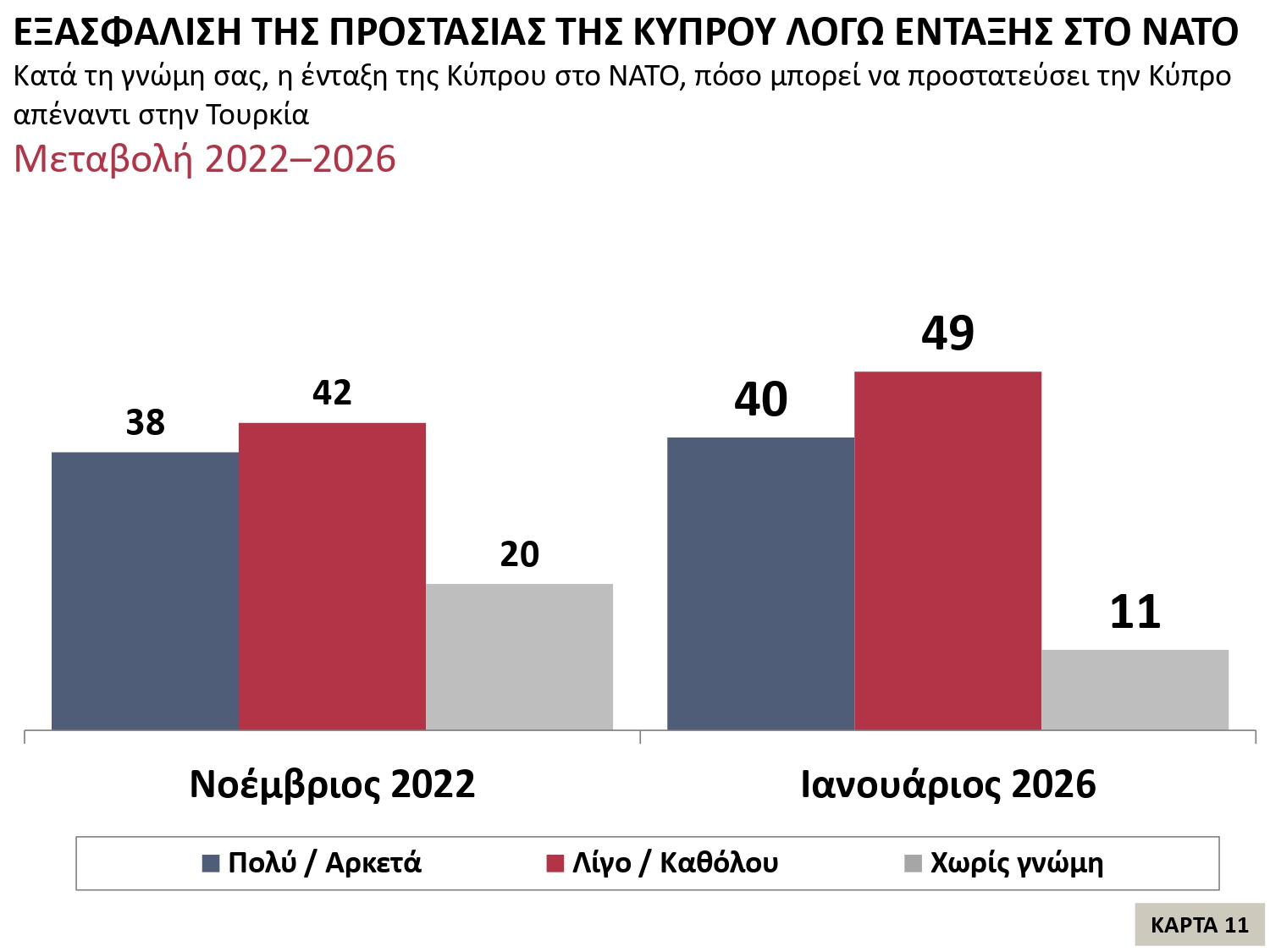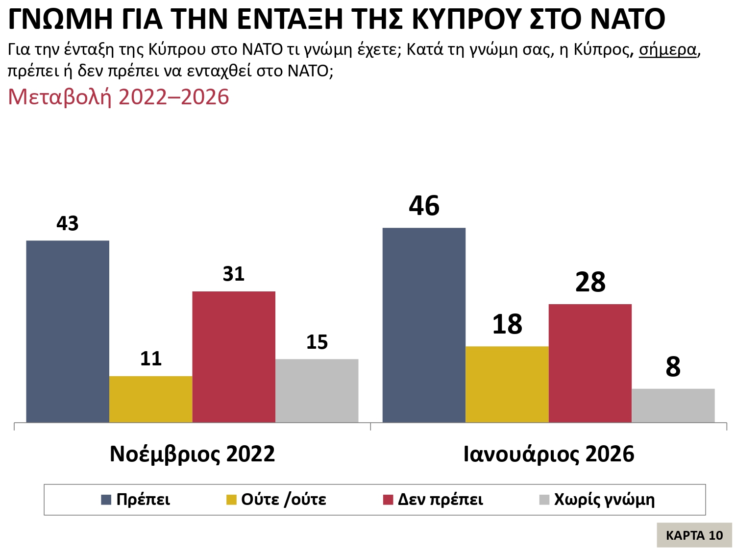 Αντίθετα, η ένταξη της Κύπρου στο ΝΑΤΟ παραμένει θέμα που διχάζει: οι απόψεις κατανέμονται σχεδόν ισομερώς μεταξύ θετικών και αρνητικών, ενώ παρατηρείται αυξημένος σκεπτικισμός ως προς το κατά πόσο η ένταξη θα μπορούσε να προσφέρει ουσιαστική προστασία απέναντι στην Τουρκία.