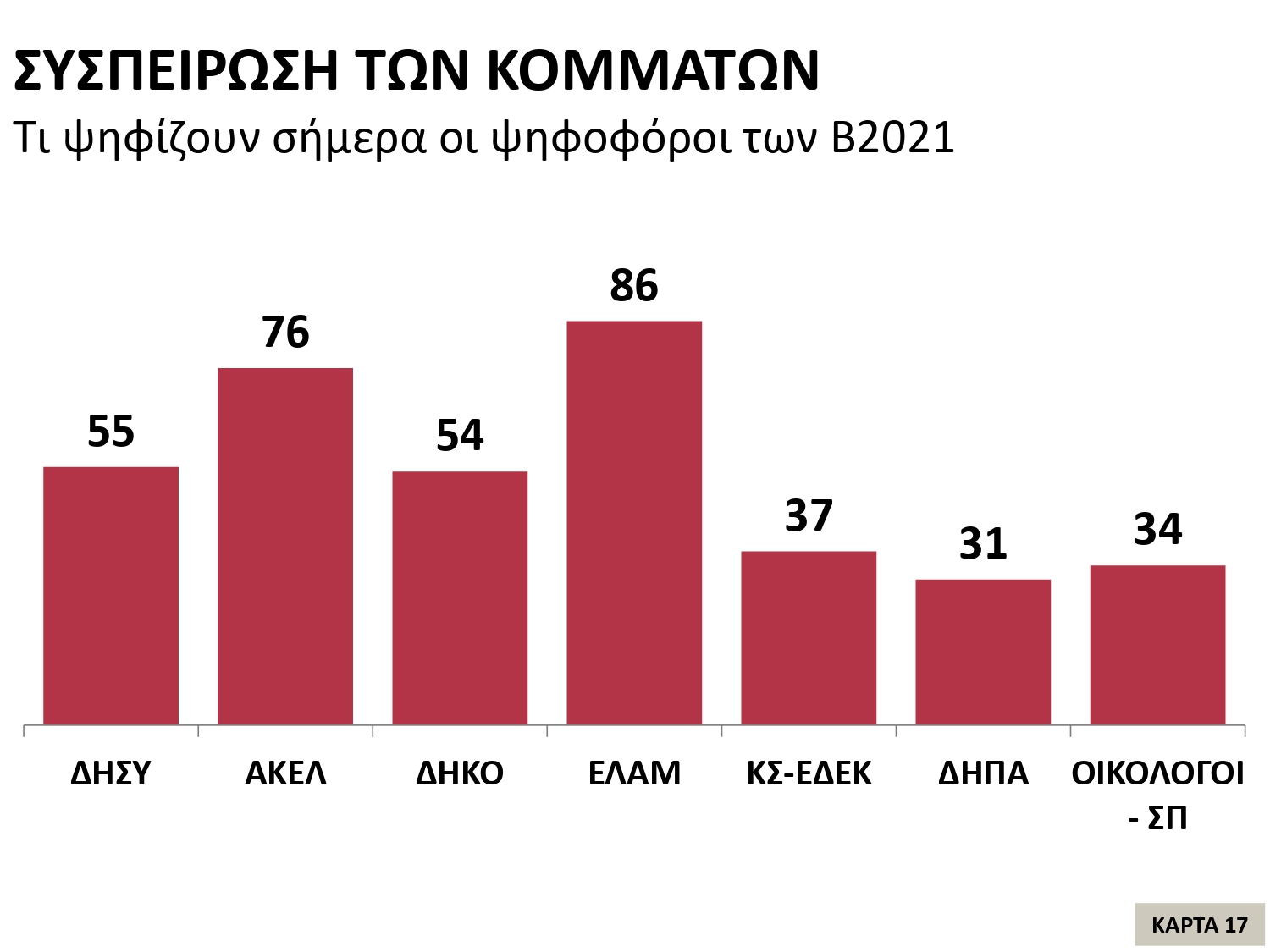 Στο ζήτημα της συσπείρωσης ΑΚΕΛ και ΕΛΑΜ κατέχουν τα υψηλότερα ποσοστά, με το ΕΛΑΜ μάλιστα να αυξάνει κατά 7 ποσοστιαίες μονάδες τη συσπείρωσή του μέσα σε λιγότερο από τρεις μήνες.