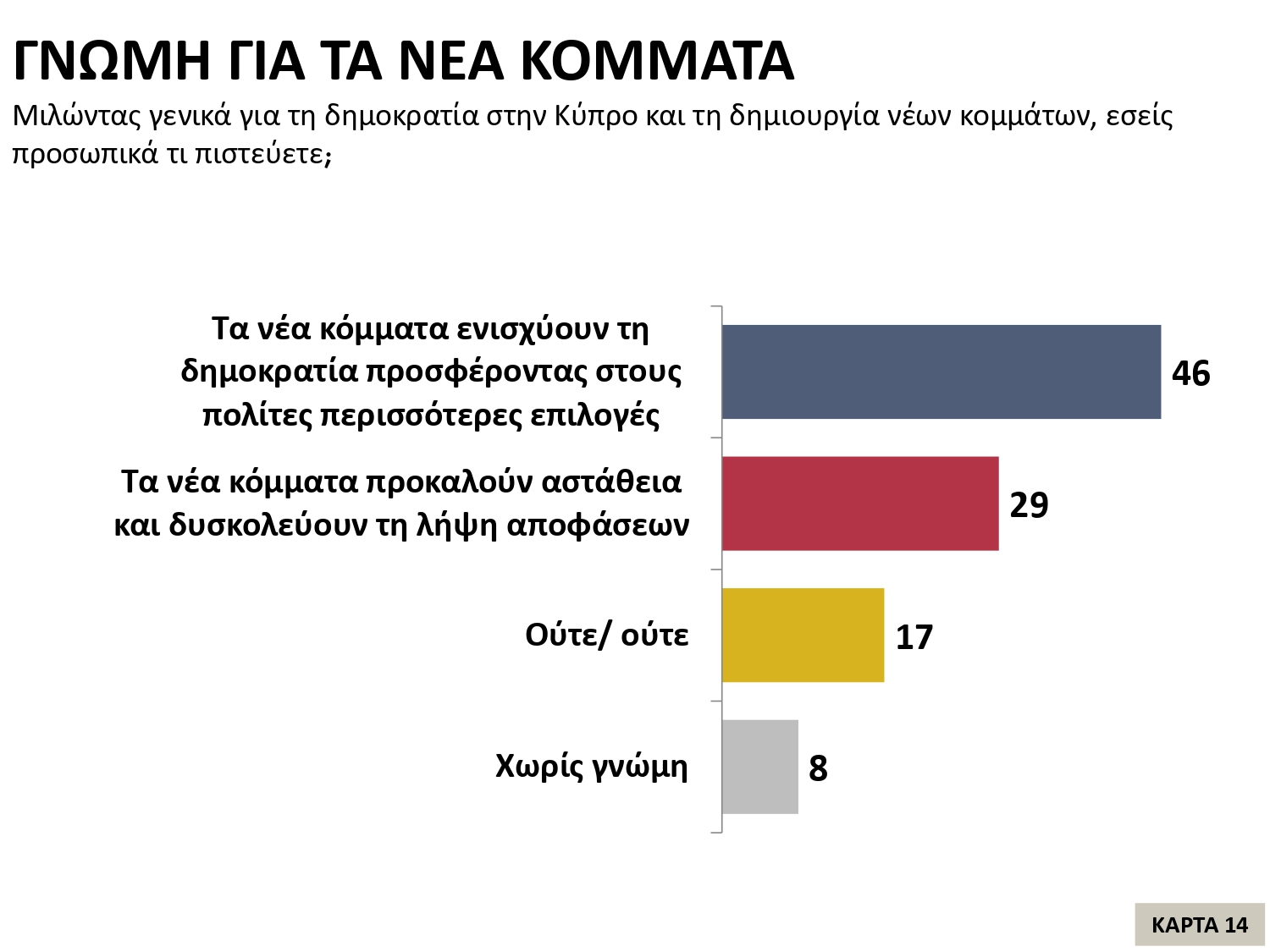 Όσον αφορά το κομματικό σύστημα, η κοινή γνώμη εμφανίζεται διχασμένη απέναντι στα νέα κόμματα: σχεδόν οι μισοί πολίτες θεωρούν ότι ενισχύουν τη δημοκρατία προσφέροντας περισσότερες επιλογές, ενώ σημαντικό ποσοστό τα συνδέει με πολιτική αστάθεια.