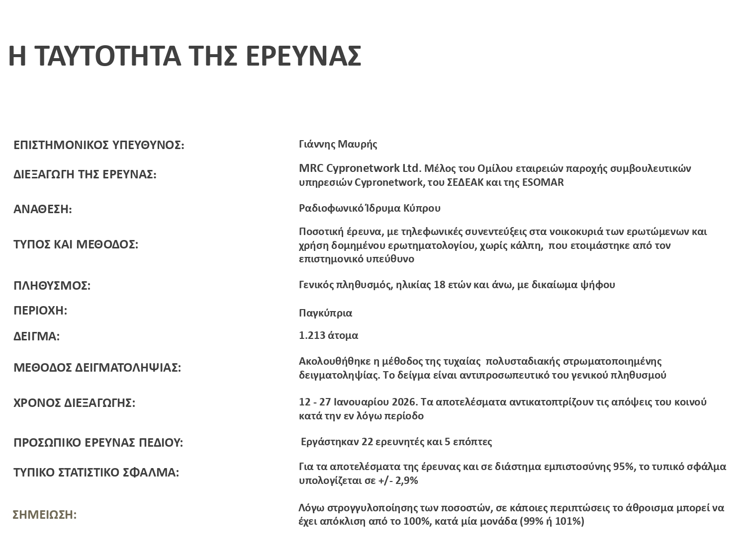 H 40η Παγκύπρια Έρευνα Πολιτικής Κουλτούρας και Εκλογικής Συμπεριφοράς πραγματοποιήθηκε με τηλεφωνικές συνεντεύξεις σε νοικοκυριά και χρήση δομημένου ερωτηματολογίου. Αφορά τον γενικό πληθυσμό της Κύπρου ηλικίας 18 ετών και άνω με δικαίωμα ψήφου και έχει παγκύπρια κάλυψη. Το δείγμα αποτελείται από 1,213 άτομα και η συλλογή δεδομένων πραγματοποιήθηκε από 12 έως 27 Ιανουαρίου 2026. Η έρευνα διεξήχθη για λογαριασμό του Ραδιοφωνικού Ιδρύματος Κύπρου (ΡΙΚ) από την MRC Cypronetwork Ltd, με επιστημονικό υπεύθυνο τον Γιάννη Μαυρή.