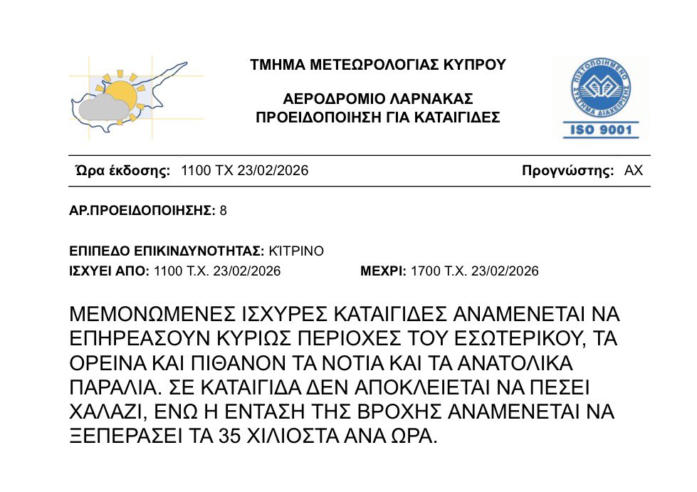 Το Τμήμα Μετεωρολογίας Κύπρου εξέδωσε σήμερα, ανήμερα της Καθαρά Δευτέρα, κίτρινη προειδοποίηση για καταιγίδες με ισχύ από τις 11:00 το πρωί έως τις 17:00 το απόγευμα.