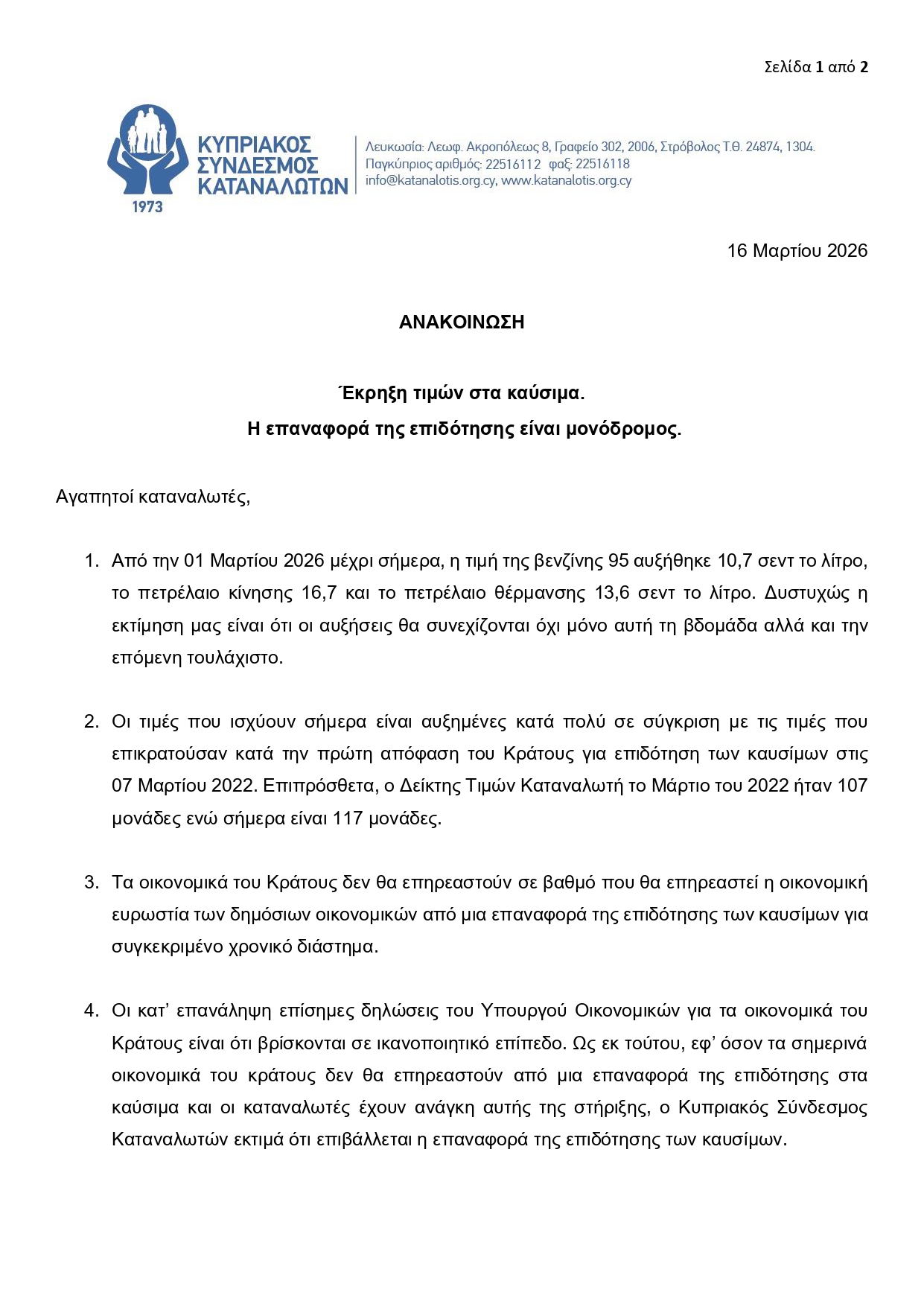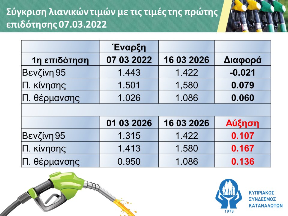 Όπως αναφέρει σε ανακοίνωσή του ο Κυπριακός Σύνδεσμος Καταναλωτών, οι τιμές των καυσίμων εκτοξεύτηκαν τις τελευταίες δυο βδομάδες και δυστυχώς θα συνεχίσουν να αυξάνονται τουλάχιστο μέχρι το τέλος του μήνα.