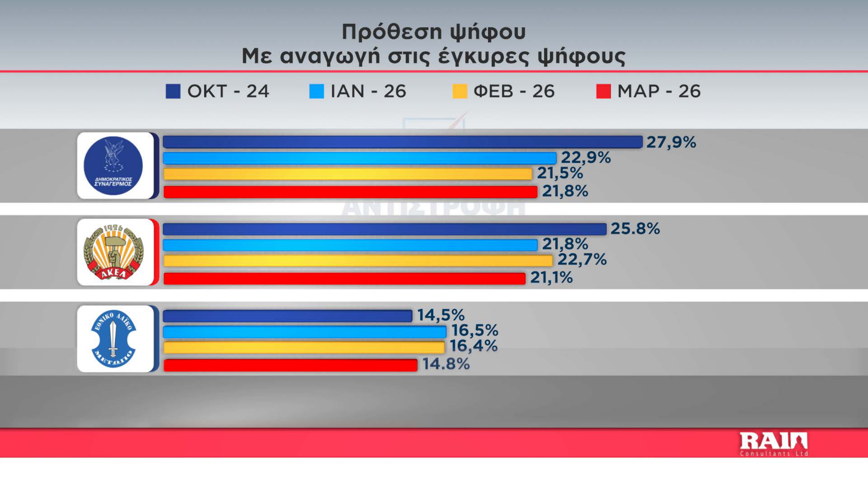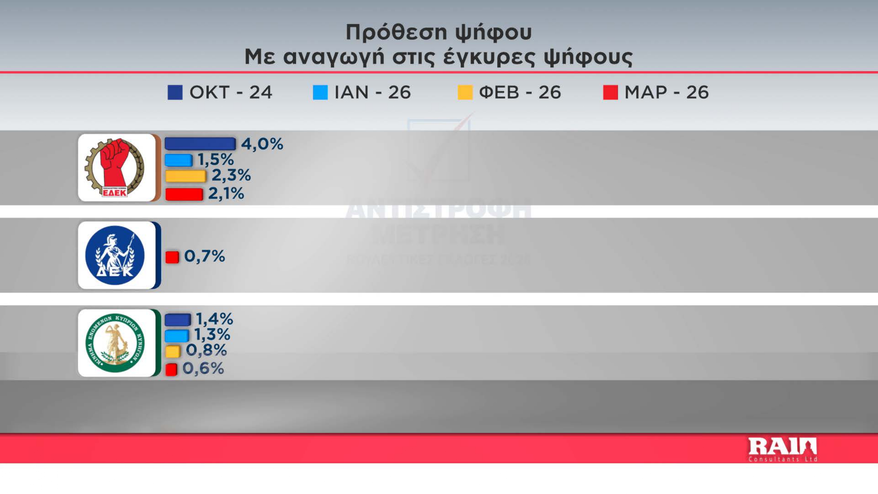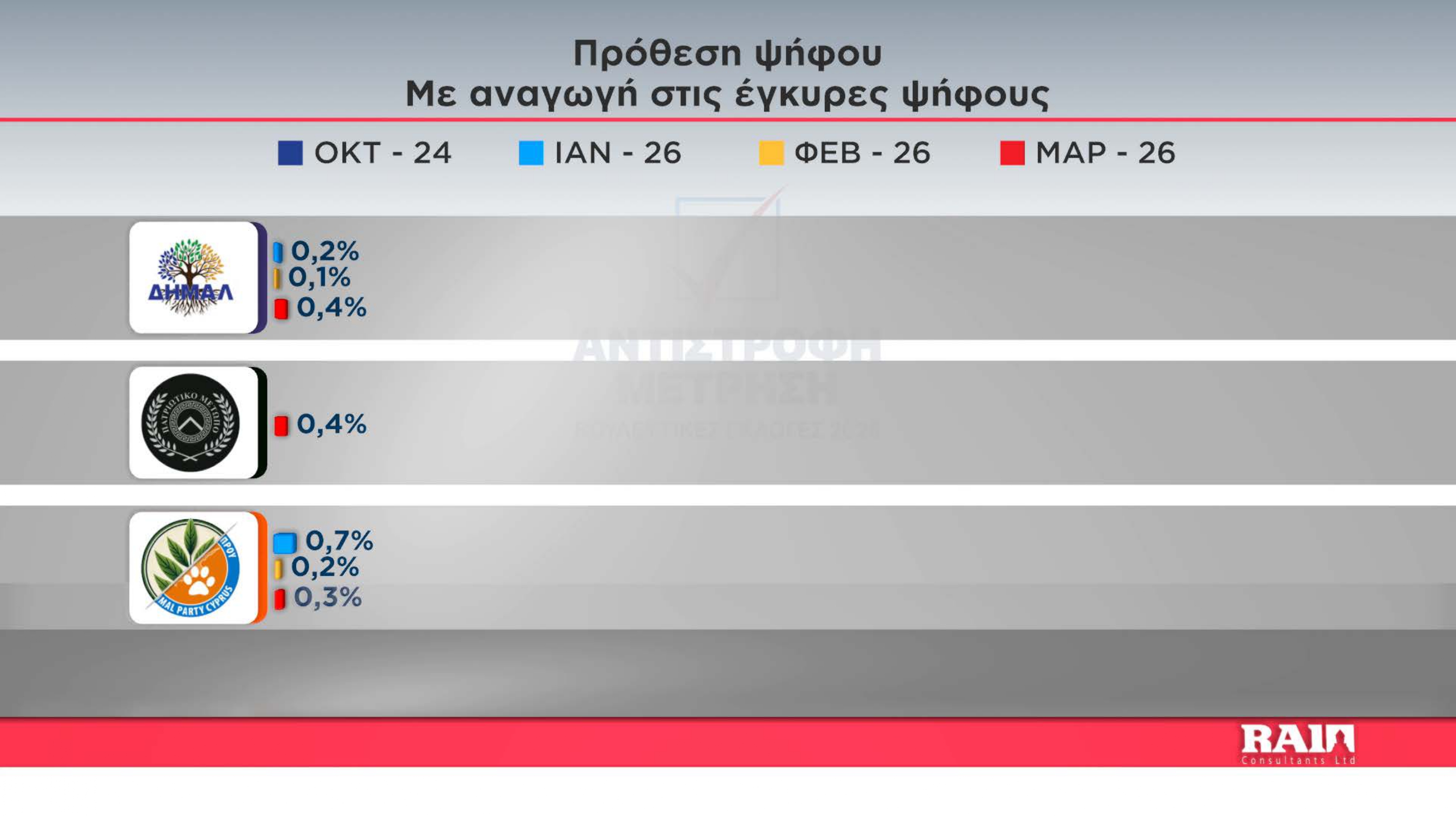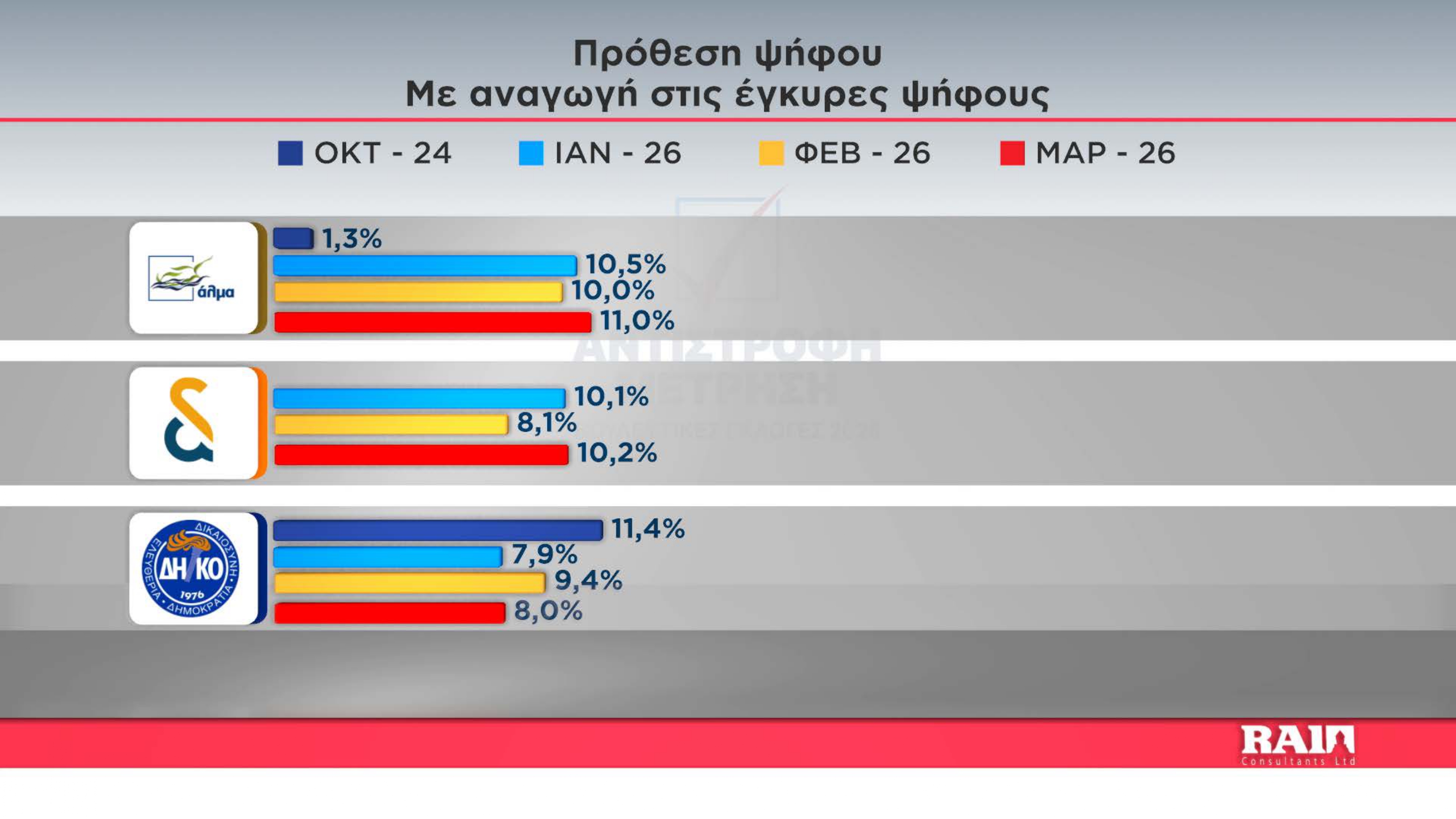 Ακολουθούν ΑΛΜΑ, Άμεση Δημοκρατία που παρουσιάζουν αύξηση στα ποσοστά τους σε σχέση με τον προηγούμενο μήνα την εξάδα κλείνει το ΔΗΚΟ με μείωση σε σχέση με τον Φεβρουάριο.