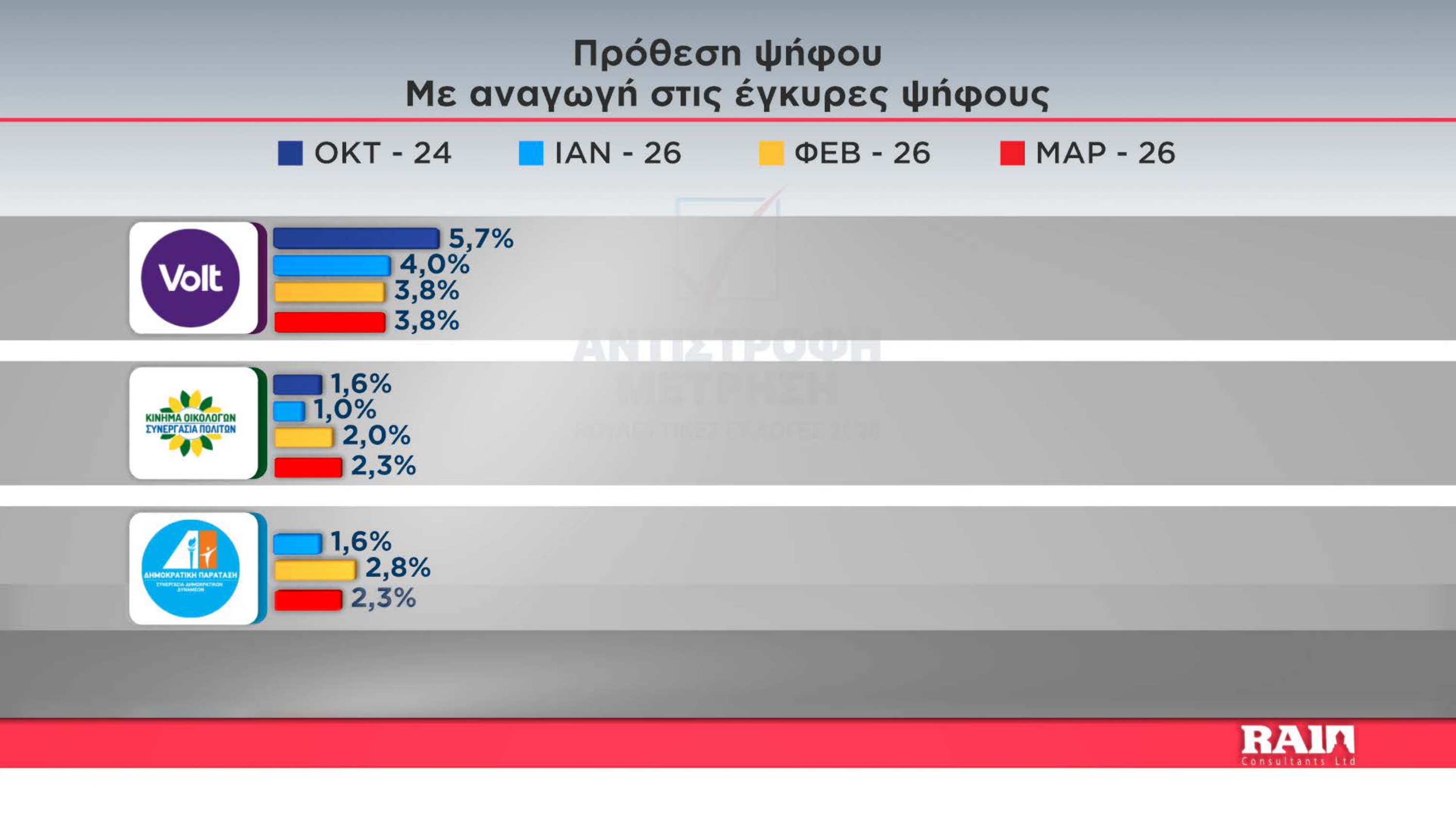Μείωση από τον Ιανουάριο και Φεβρουάριο 2026 καταγράφει και το ΕΛΑΜ το οποίο όμως παραμένει τρίτο κόμμα.