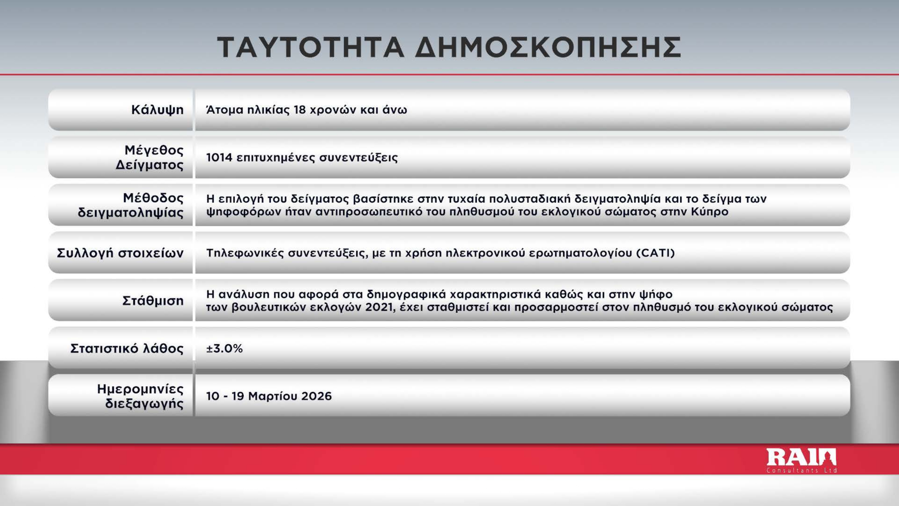 Στη δημοσκόπηση πραγματοποιήθηκαν 1,014 συνεντεύξεις την περίοδο 10-19 Μαρτίου.