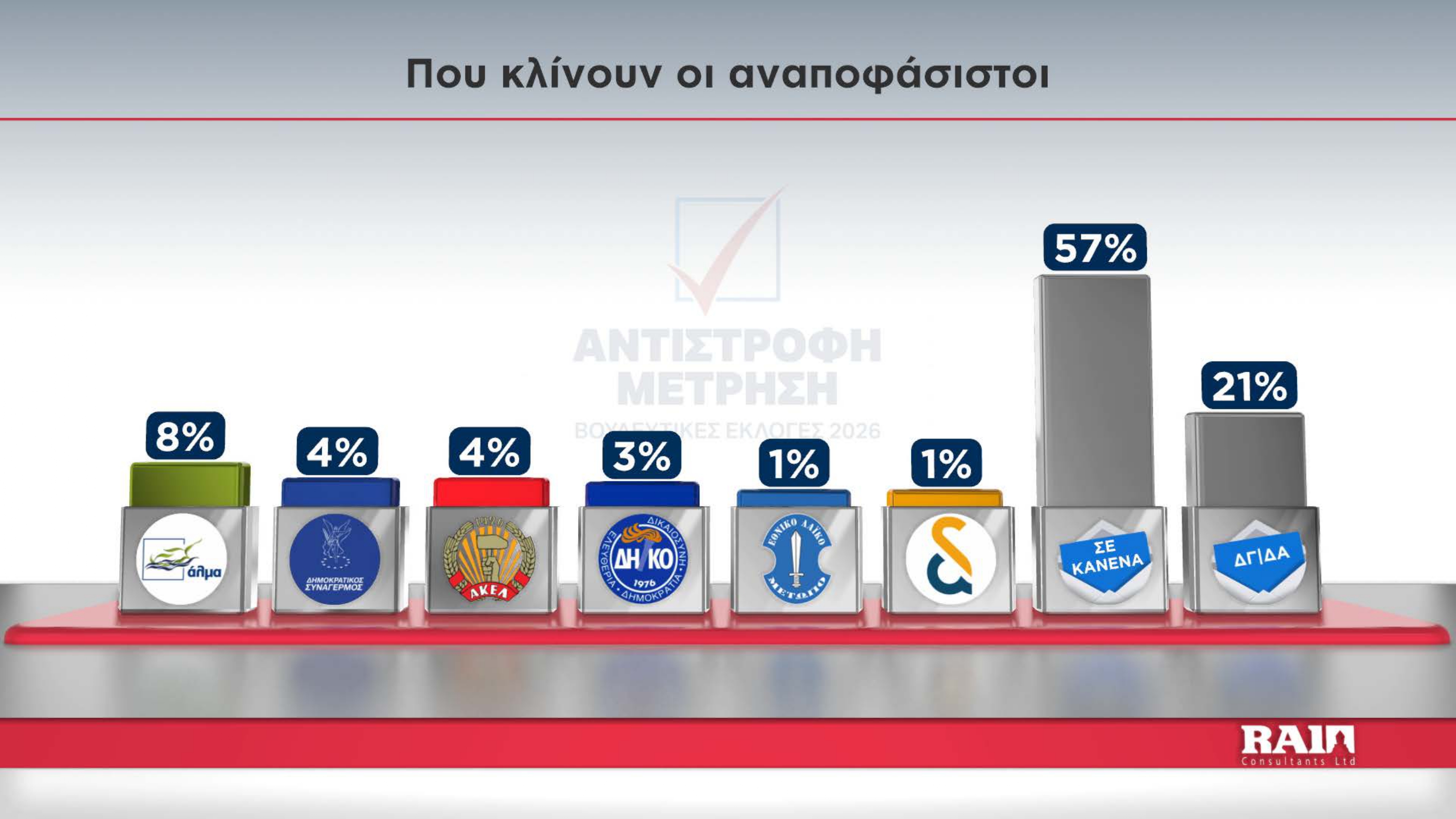 Σε κανένα κόμμα δεν κλίνουν οι μισοί από τους αναποφάσιστους με ένα 8% να κερδίζει ενδεχομένως το ΑΛΜΑ κάτι που σημαίνει ότι ίσως λάβει ακόμη μεγαλύτερα ποσοστά.