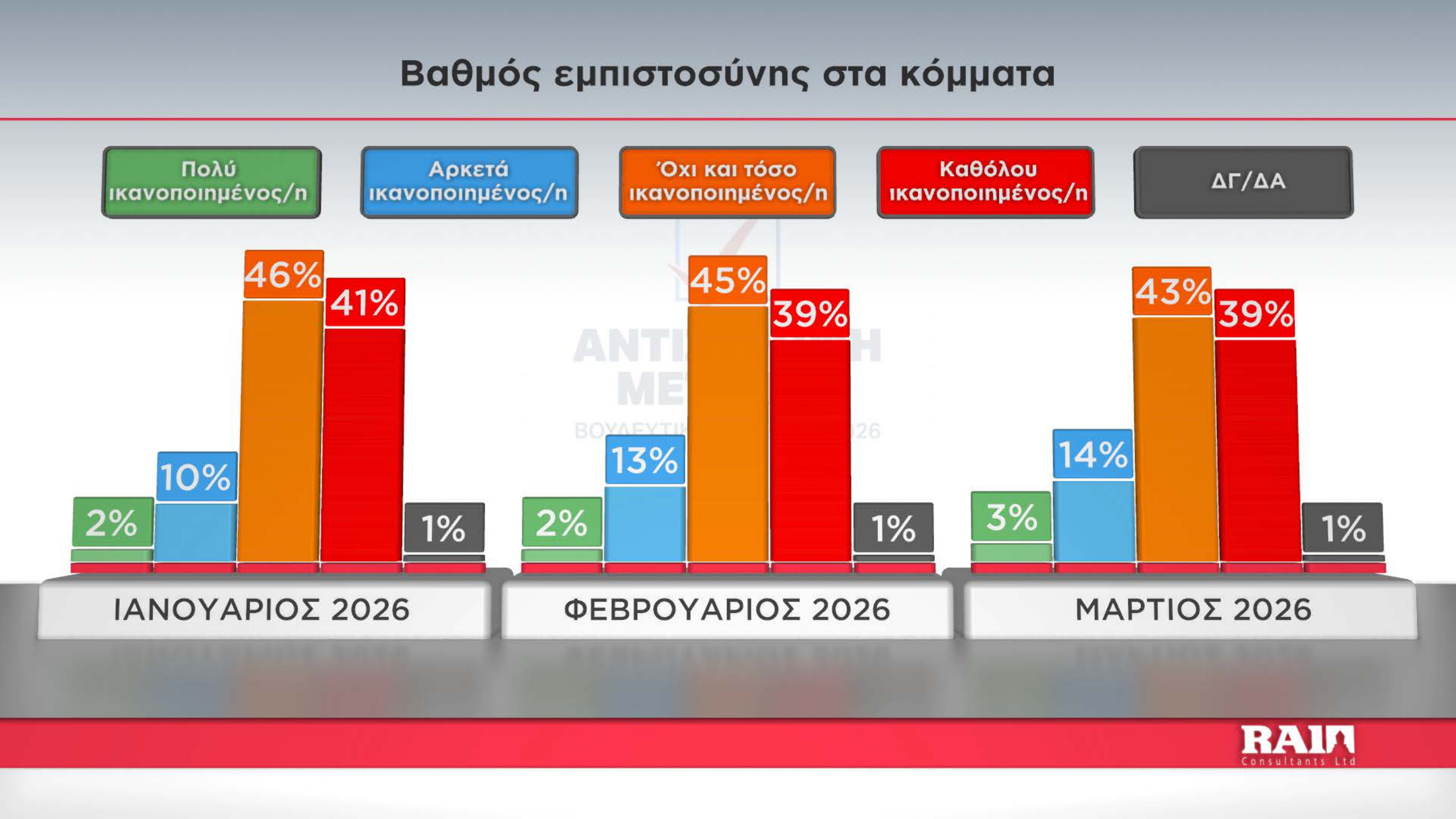 Συγκεκριμένα. τον Μάρτιο του 2026, το 10% δηλώνει «πολύ ικανοποιημένο» και το 29% «αρκετά ικανοποιημένο», συγκεντρώνοντας συνολικά ποσοστό 39% θετικών απόψεων.